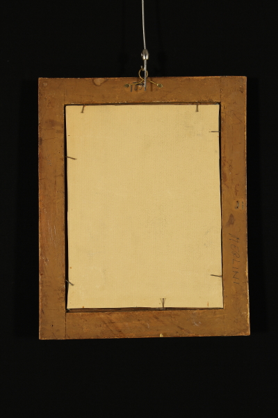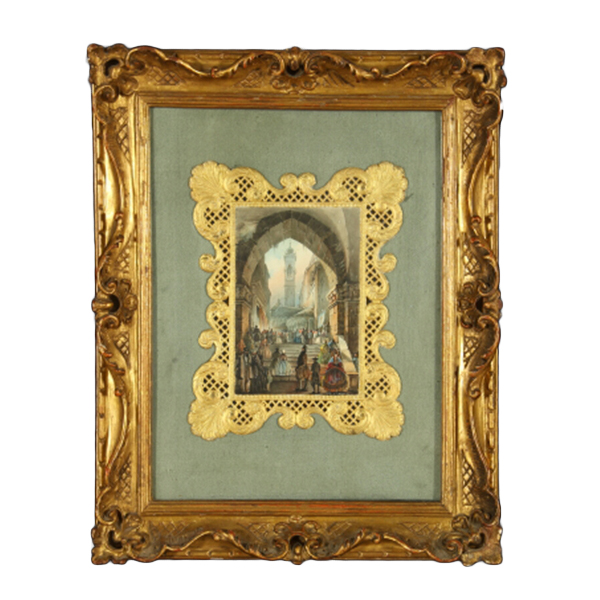 Tecnica mista su carta. Firmato in basso a destra. Il piccolo dipinto, ricco di personaggi e dettagli, è gradevolmente composto usando l'arco come quinta architettonica, centrando lo sguardo sulla chiesa sullo sfondo, con una funzione in corso. Marco Ravazzi fu soprattutto noto per i suoi affreschi a soggetto storico, ma sono noti anche suoi dipinti di piccolissimo formato. L'opera è presentata in cornice dorata di fine '800.