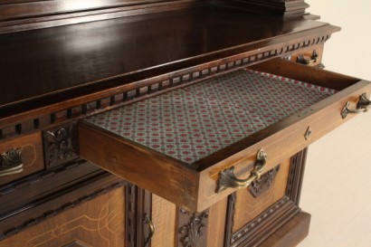 Dal fronte spezzato, presenta coppia di ante e tre cassetti. Alzata retta da due coppie di colonne presenta tre ante di cui le laterali con vetri piombati. Intagli e intarsi in acero.