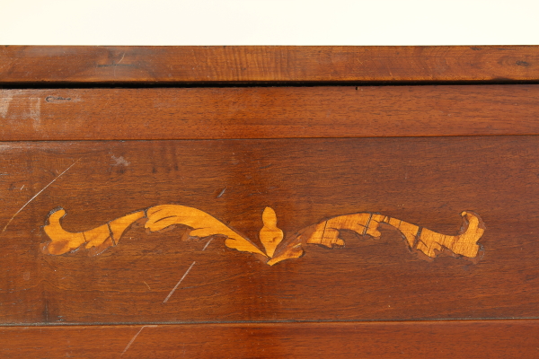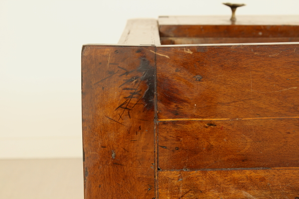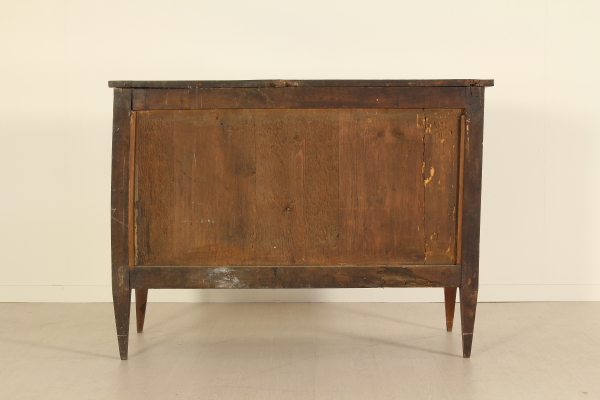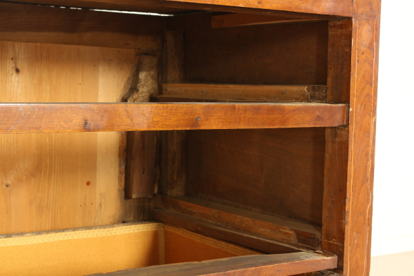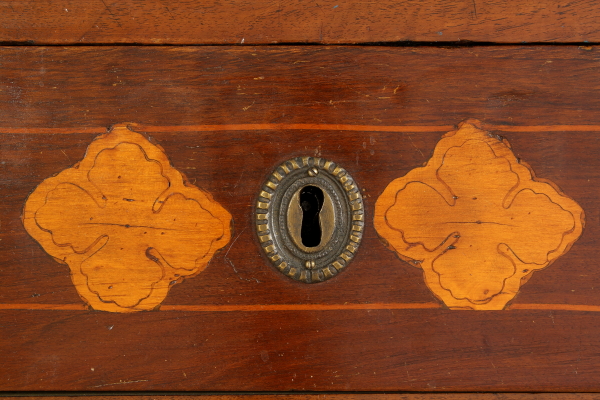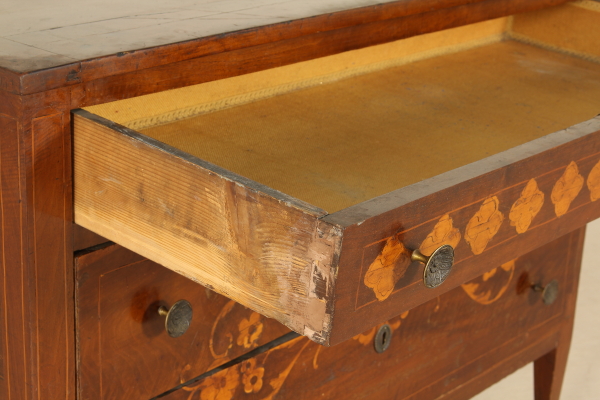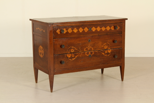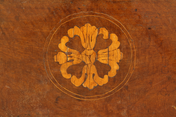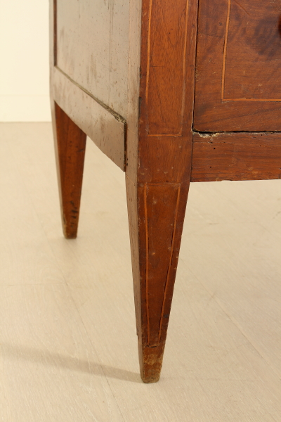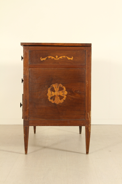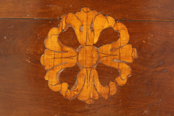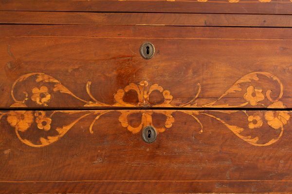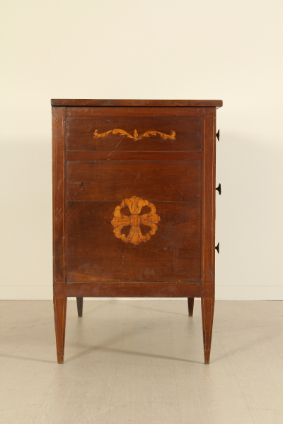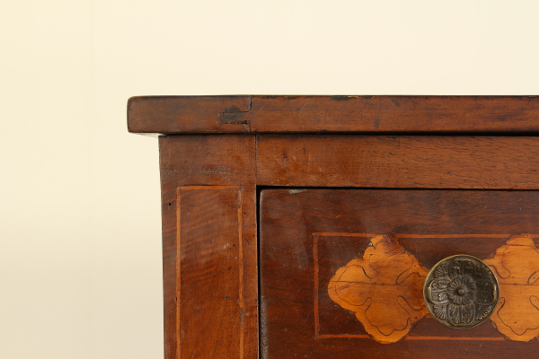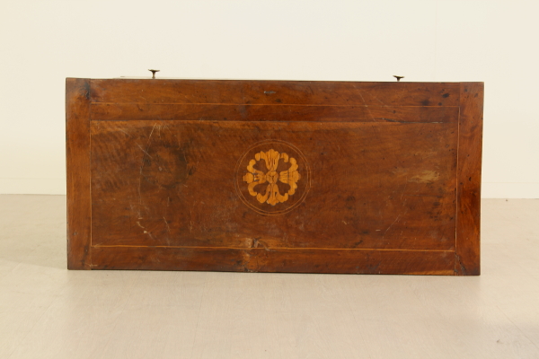 Retto da piedi tronco-piramidali presenta tre cassetti. Sull'intera superficie intarsi a toppo aggiunti in epoca successiva come abbellimenti. Ferramenta non coeva.