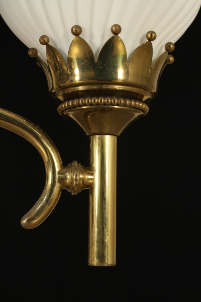 Lampada a soffitto; ottone, diffusori in vetro opalino. Buone condizioni, presenta piccoli segni di usura, non è stato revisionato.