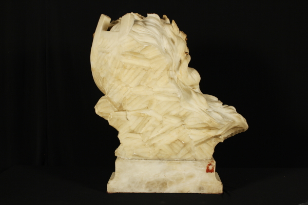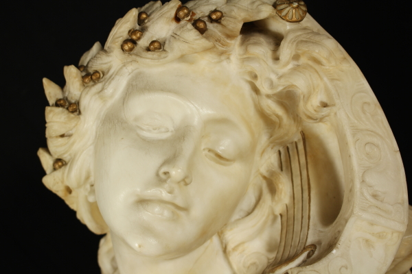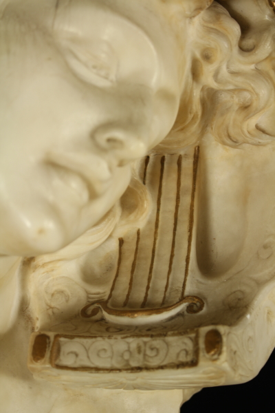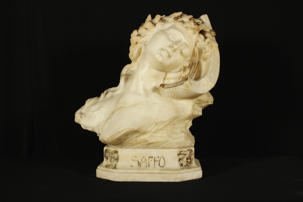 Scultura in alabastro, con doratura sul serto d'alloro. Il busto ritrae Saffo, celebra poetessa greca del VI secolo a.c., con la sua lira; poggia su basamento indipendente con il nome e decorato ai lati da maschere teatrali. Firmata