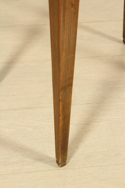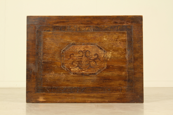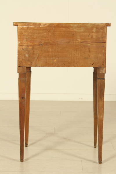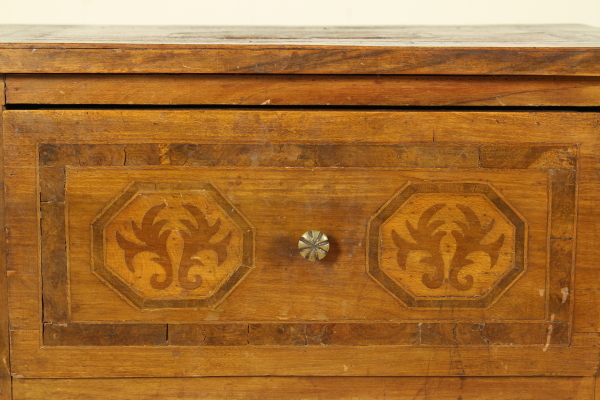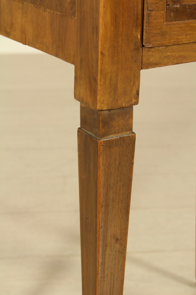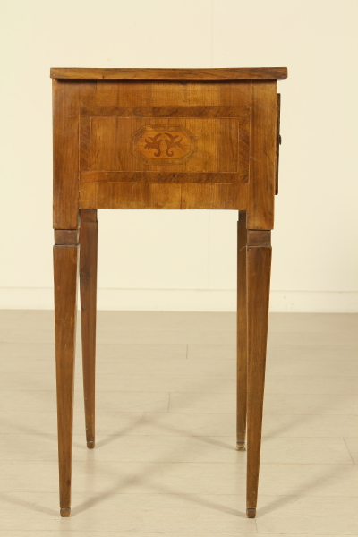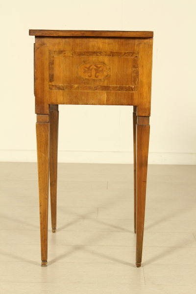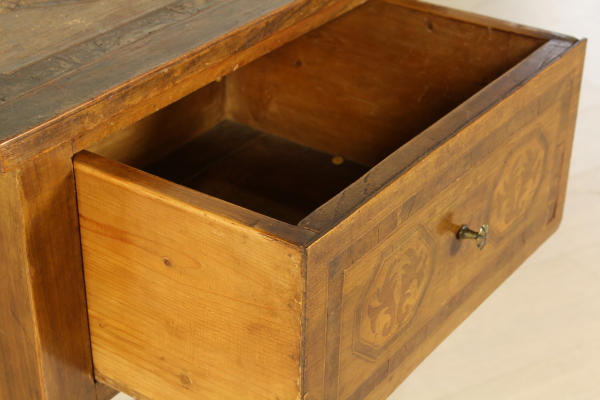 Retto da gambe tronco-piramidali presenta fascia con cassetto. Fascia e piano lastronati con filettature e riserve con intarsi floreali. Assemblato in parte con legname d'epoca.