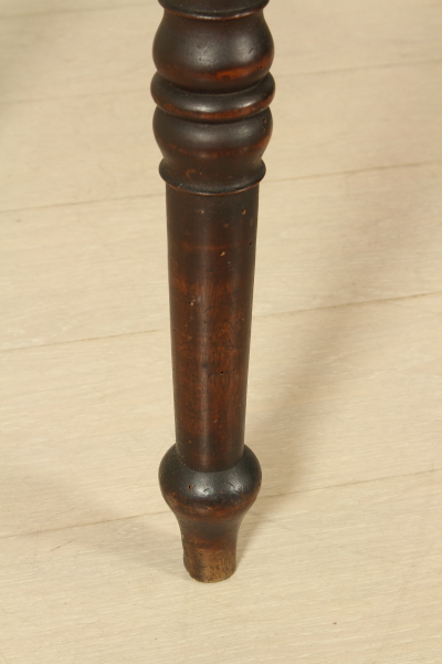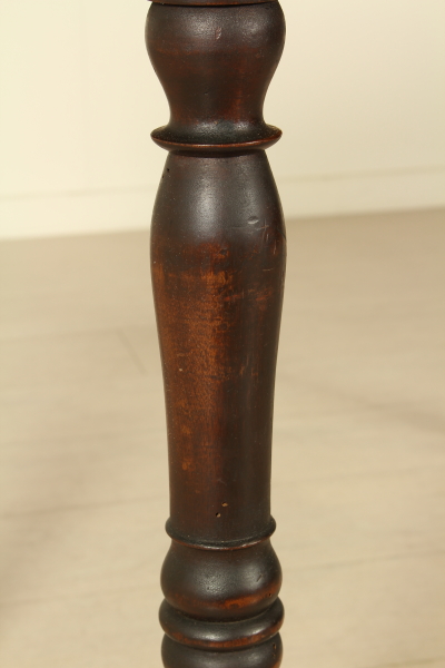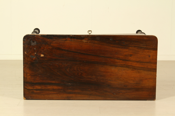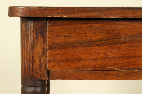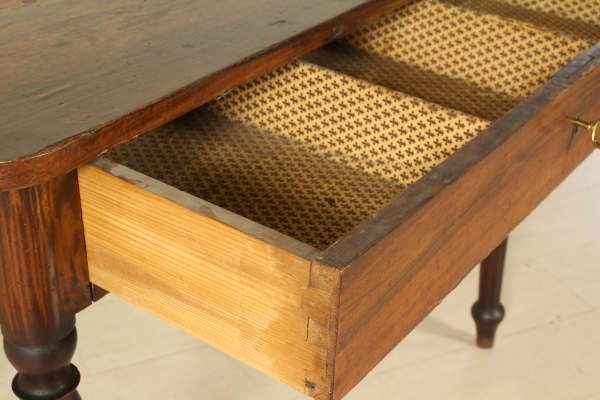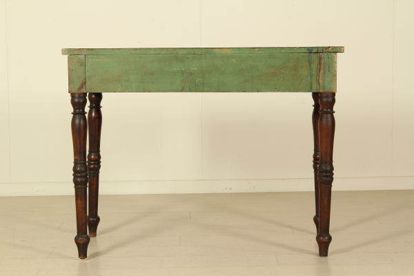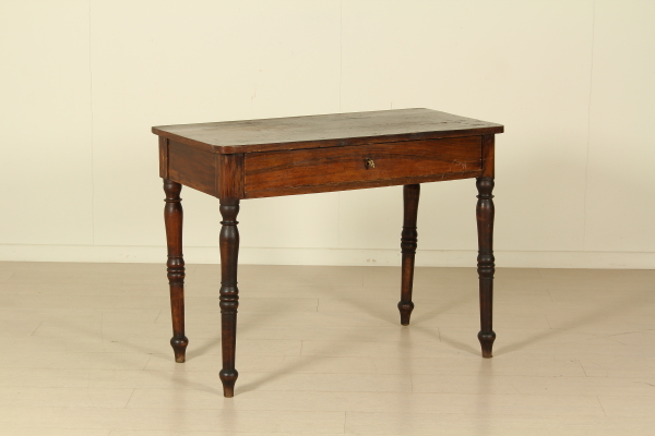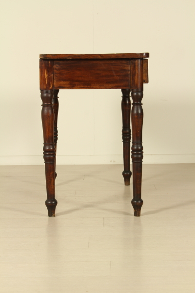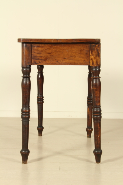Retto da gambe tornite presenta cassetto nella fascia. Piano sagomato impiallacciato noce venato.