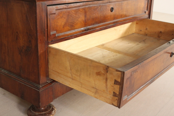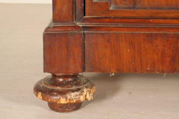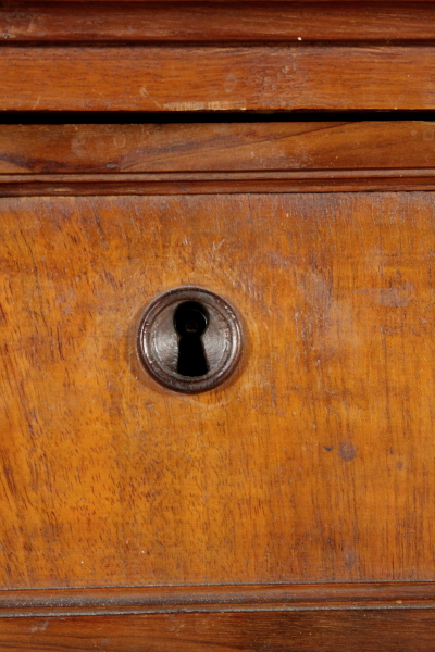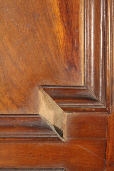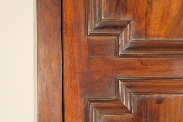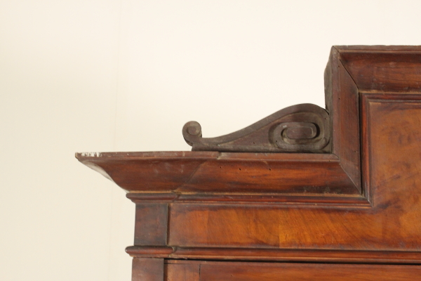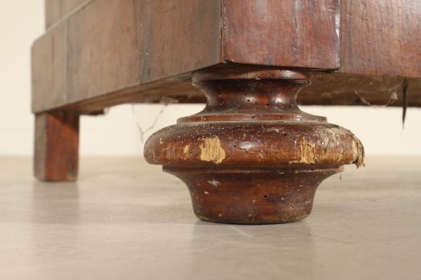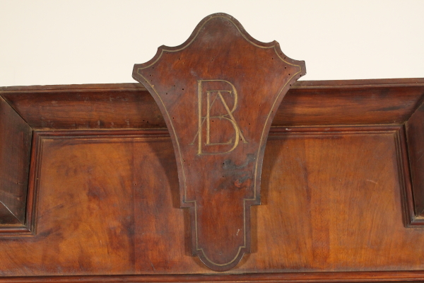 Retto da piedi torniti presenta due cassetti e due ante con pannelli sagomati in noce venato massello. Cimasa architettonica con stemma centrale e lesene.