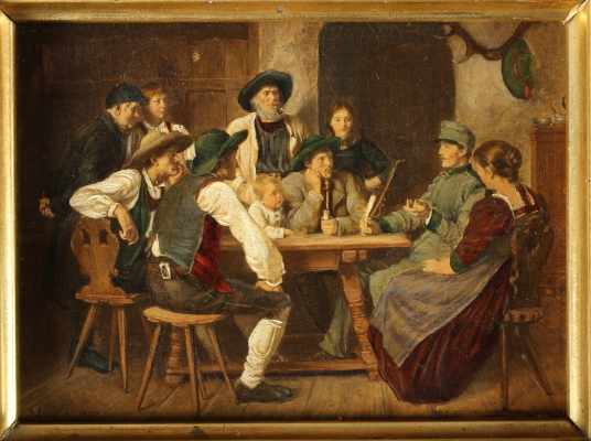 Olio su carta applicata a tavoletta. Firmata in basso a sinistra e datata 1887. Il pittore tirolese, specialista in scene di vita popolare, è efficace nella resa realistica e veritiera dell'immagine, pur lavorando, come in questo caso, su dipinti di piccolo formato.
