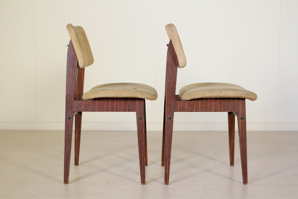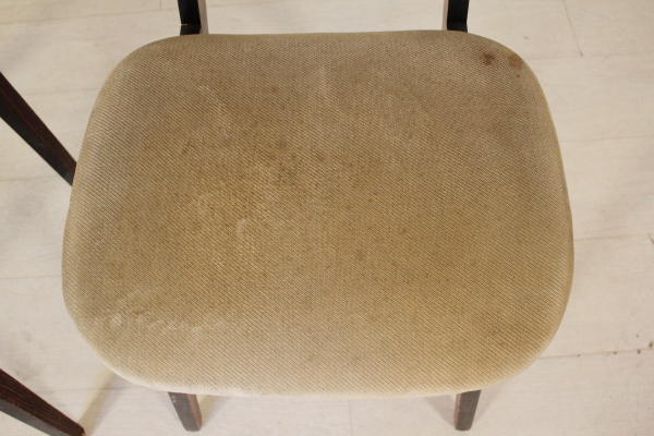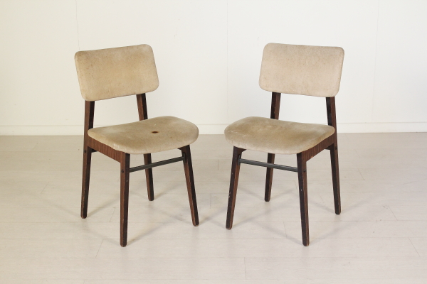 Coppia di sedie; legno di palissandro, imbottitura in espanso, rivestimento in velluto. Discrete condizioni, presenta alcuni segni di usura sul rivestimento.