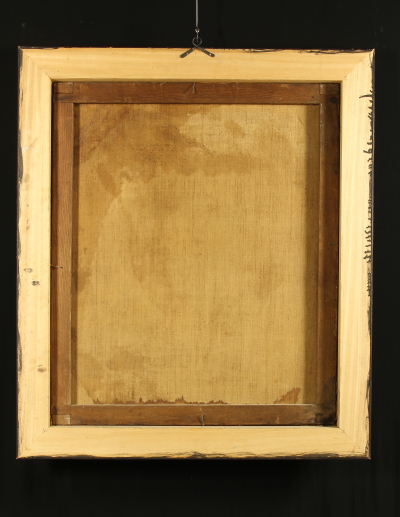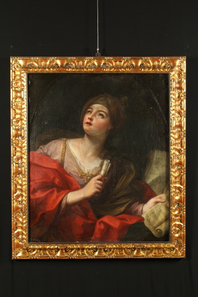Olio su tela di anonimo autore barocco. L'opera, in origine, si presentava in formato ovale, come visibile dal segno di tensionatura del precedente telaio ed anche dal leggero flettersi della pagina dello spartito a destra, che pare seguire l'andamento curvo del bordo. Le aggiunte degli angoli, comunque antiche, sono state reintelate ad inizio '900. L'impostazione del panno, energica e voluminosa, si coniuga ad una delicata cromia ed un classicismo di origine emiliano e carraccesco; ciò lascia immaginare ad un autore attivo a Roma nella seconda parte del secolo XVIII. Presentato in cornice in stile.