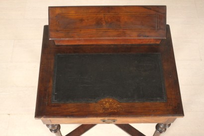 Retto da gambe tornite su rotelle raccordate da crociera. Fascia con cassetto. Piano con inserto in pelle e intarsio. Alzatina con piano apribile, all'interno vani sagomati.
