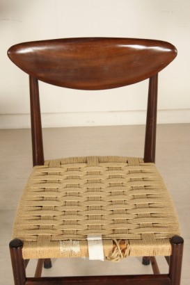 Coppia di sedie; legno di faggio tinto, corda di canapa intrecciata. Discrete condizioni, presentano alcuni segni di usura.