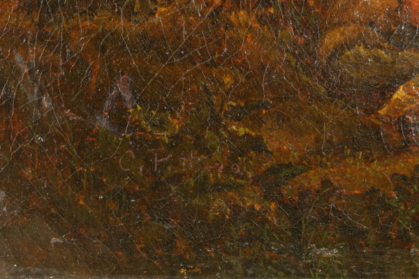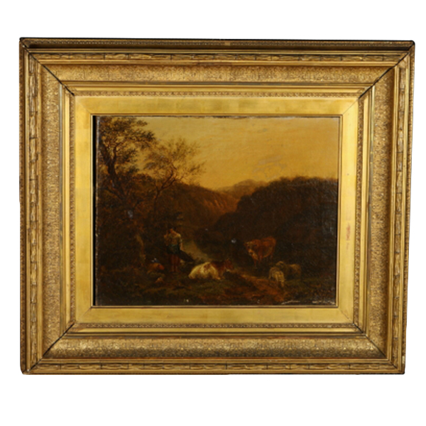 Paesaggio con pastori ed armenti. Olio su tela. In basso a sinistra è firmato Carlo Pittara; le firma risulta apposta successivamente all'esecuzione dell'opera, che pare oltretutto lontana dalla pittura di realtà che caratterizza l'artista, ma piuttosto ancora debitrice della antecedente atmosfera romantica. In prima tela; segni di due rattoppi. Presentato in cornice di fine '800. Richiede pulizia.