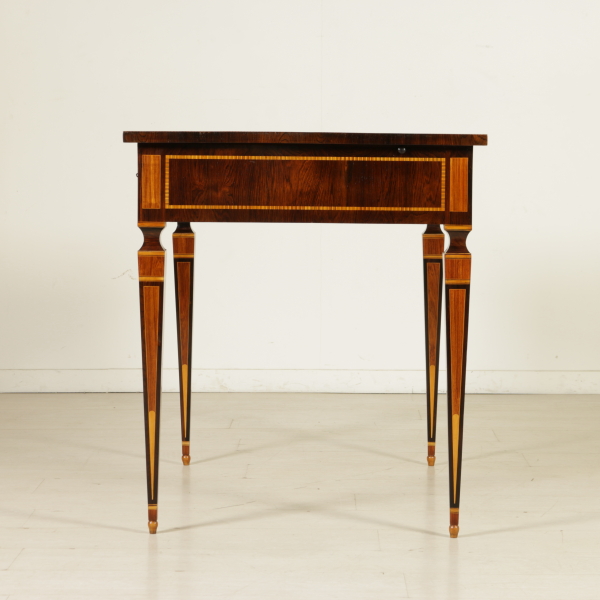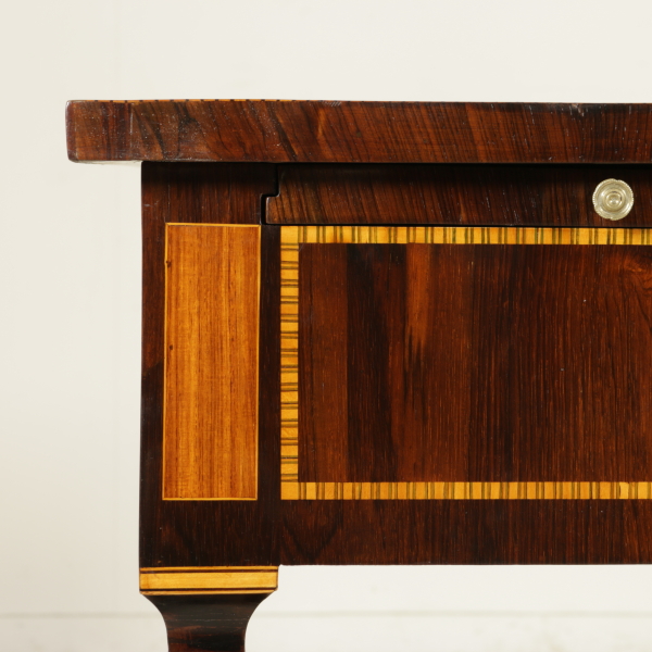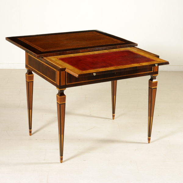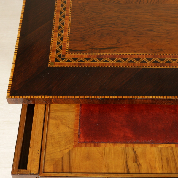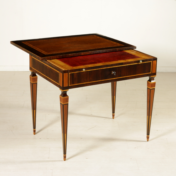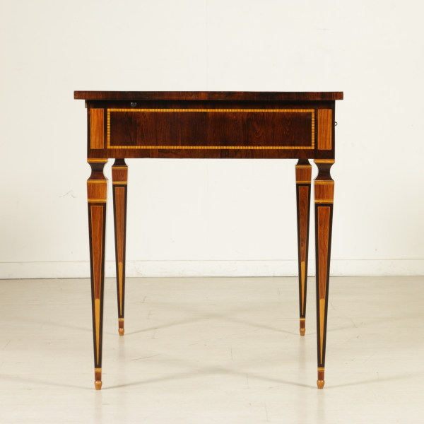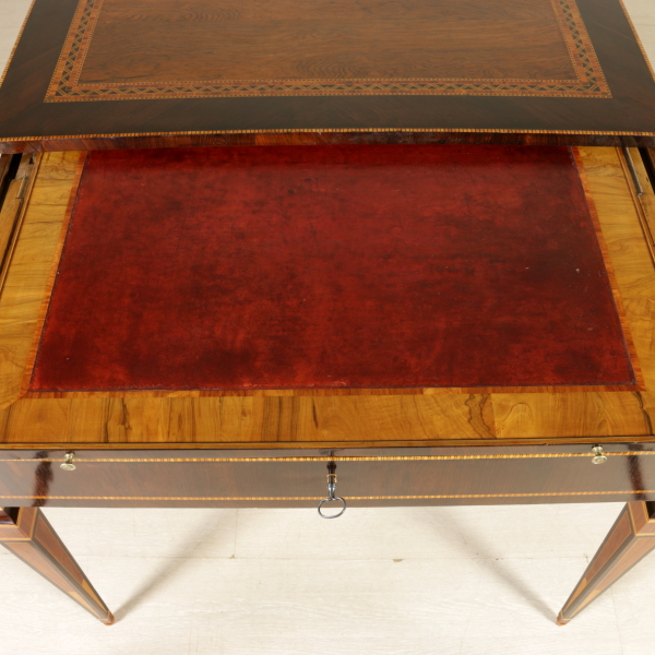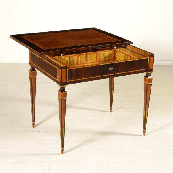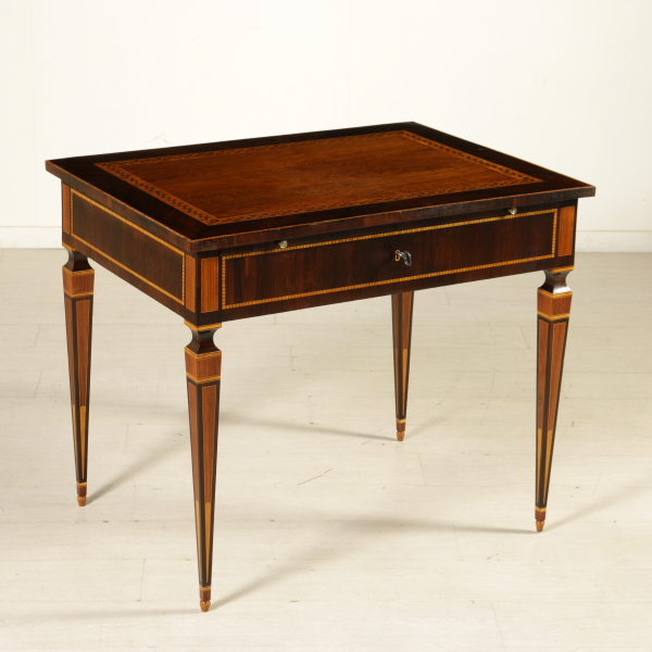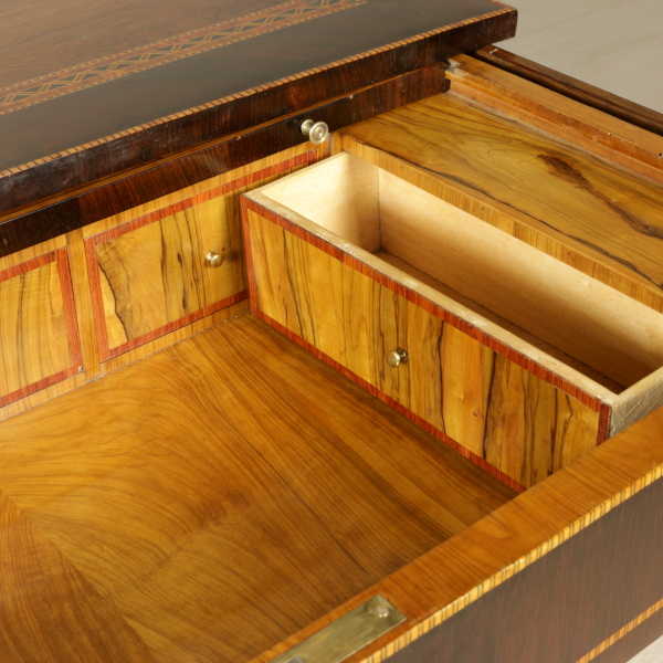 Scrivani meccanica retta da quattro gambe tronco piramidali con strozzatura sotto fascia e piedino tornito a trottola che si raccordano ad una fascia su cui poggia un piano scorrevole, contenente un secondo tiretto con piano in marocchino e cassetti distribuiti sui bordi e celanti segreti. Attraverso precisi meccanismi a molla in acciaio si riesce ad ottenere lo scorrimento e l'apertura del tavolino, che all'interno si presenta lastronato in ulivo con filettature in bois de rose e pomoli in bronzo dorato. Esternamente il tavolo è elegantemente impiallacciato in palissandro e bois de rose con un semplice disegno di riserve incorniciate da elaborati filetti ed inserti in acero chiaro che accentuano il gioco cromatico dei legni. Sul piano una greca racchiude una riserva in palissandro più chiaro.