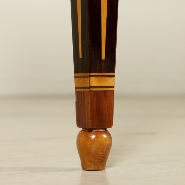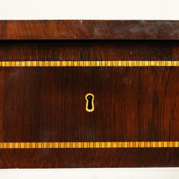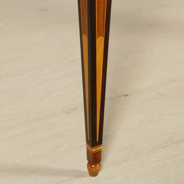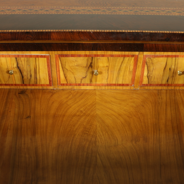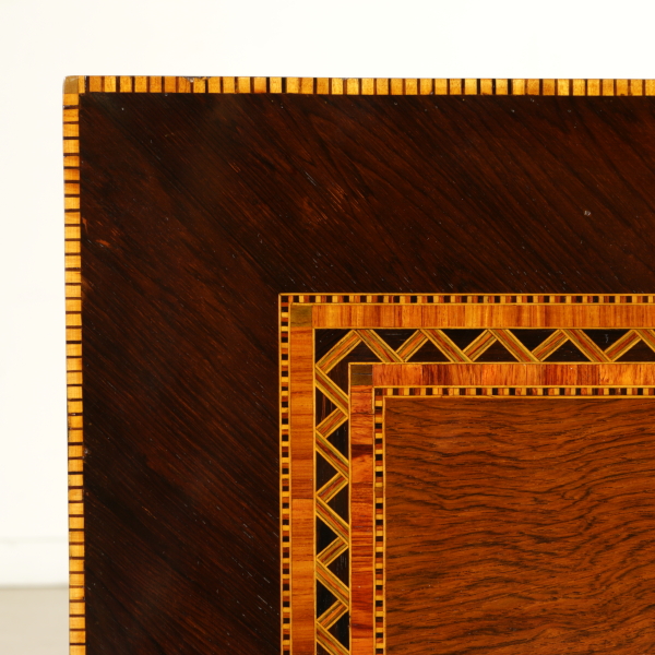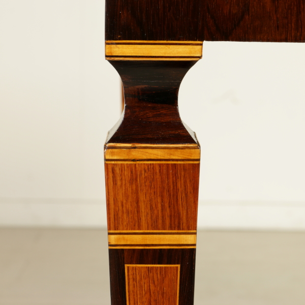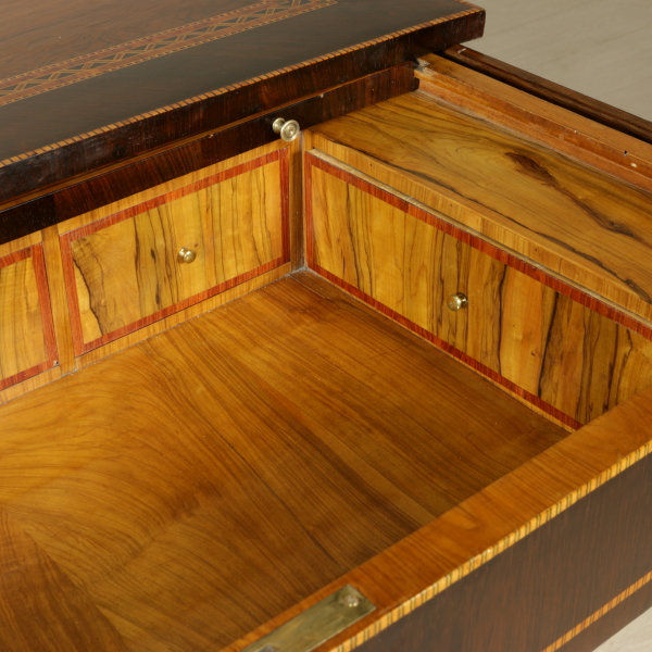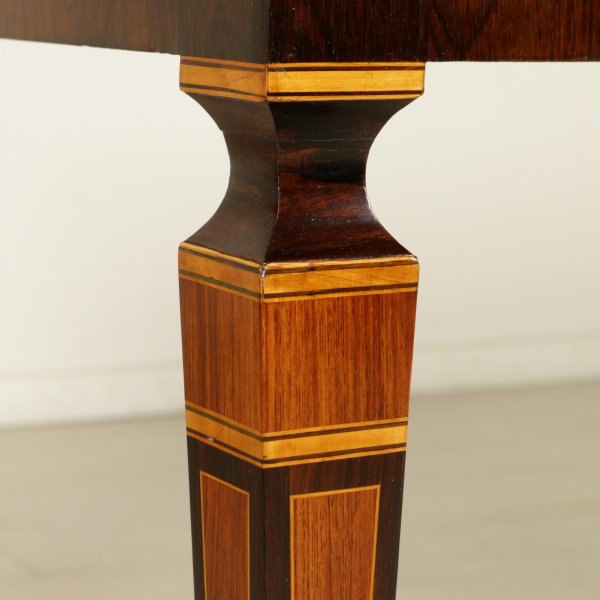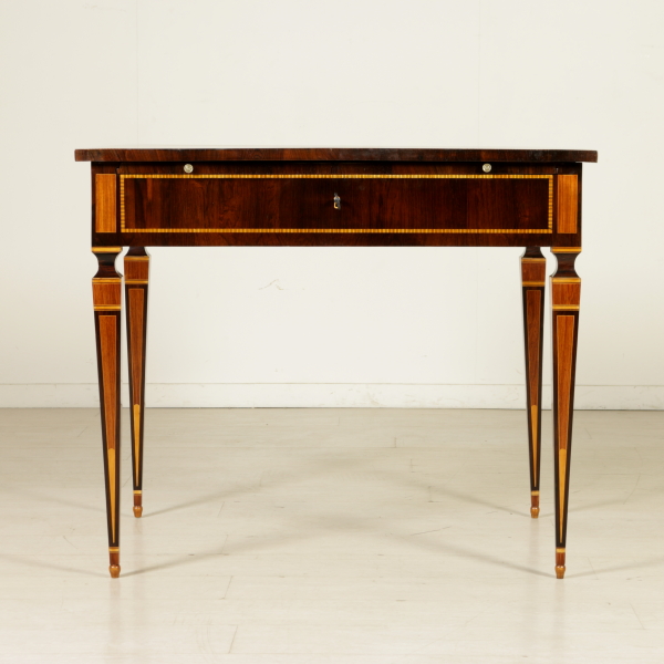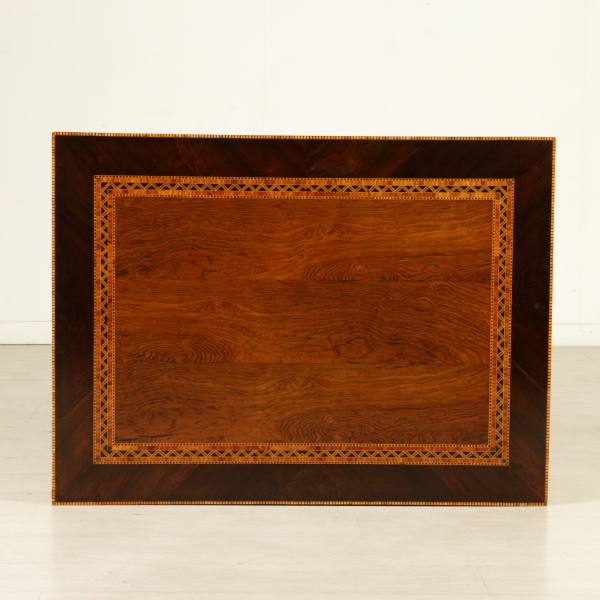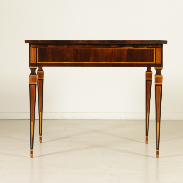 Scrivani meccanica retta da quattro gambe tronco piramidali con strozzatura sotto fascia e piedino tornito a trottola che si raccordano ad una fascia su cui poggia un piano scorrevole, contenente un secondo tiretto con piano in marocchino e cassetti distribuiti sui bordi e celanti segreti. Attraverso precisi meccanismi a molla in acciaio si riesce ad ottenere lo scorrimento e l'apertura del tavolino, che all'interno si presenta lastronato in ulivo con filettature in bois de rose e pomoli in bronzo dorato. Esternamente il tavolo è elegantemente impiallacciato in palissandro e bois de rose con un semplice disegno di riserve incorniciate da elaborati filetti ed inserti in acero chiaro che accentuano il gioco cromatico dei legni. Sul piano una greca racchiude una riserva in palissandro più chiaro.