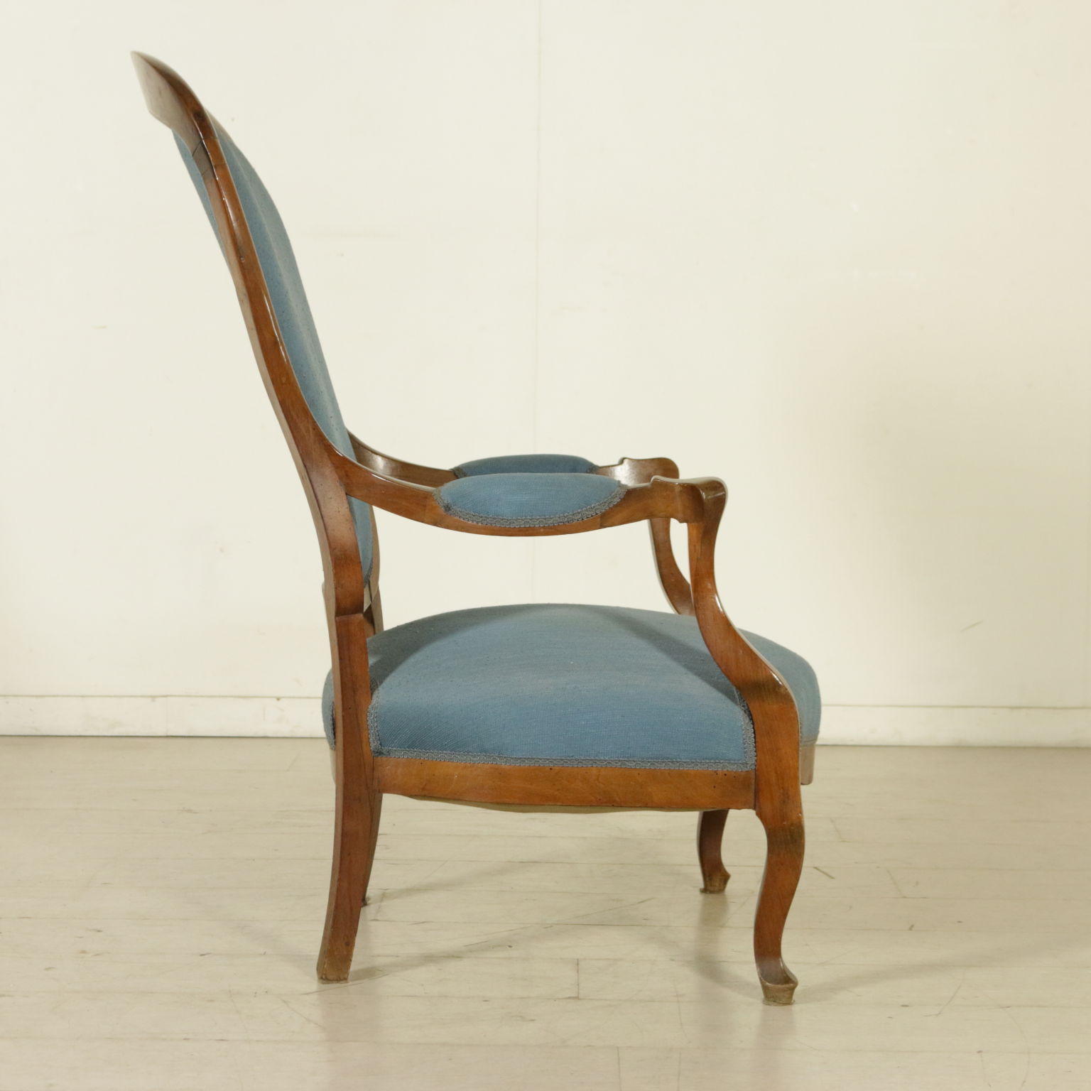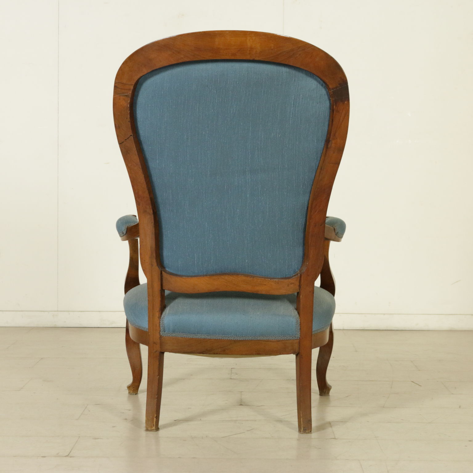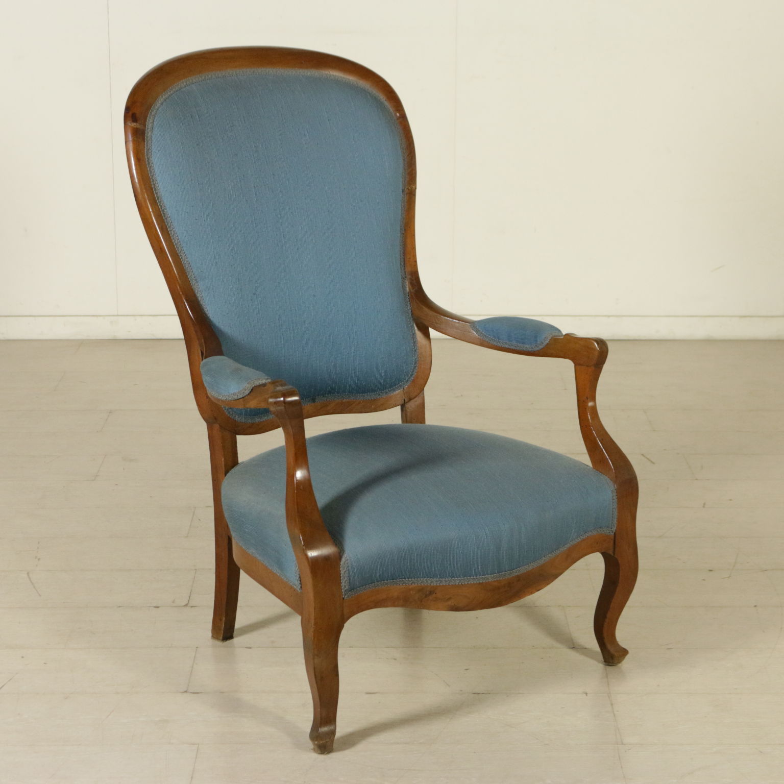 Poltrona dalla linea mossa con schienale e seduta imbottiti. Presenta rotture. In noce. Antiquariato, Italia, metà '800.