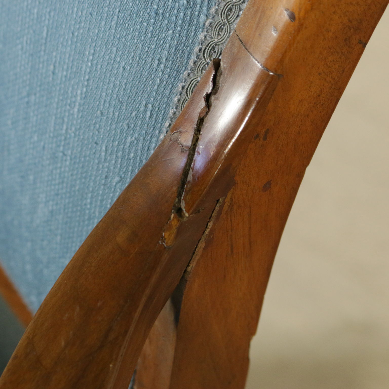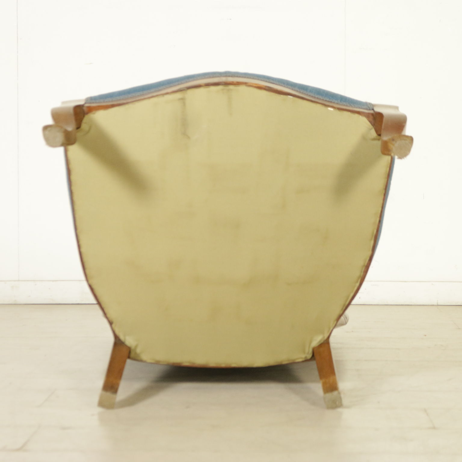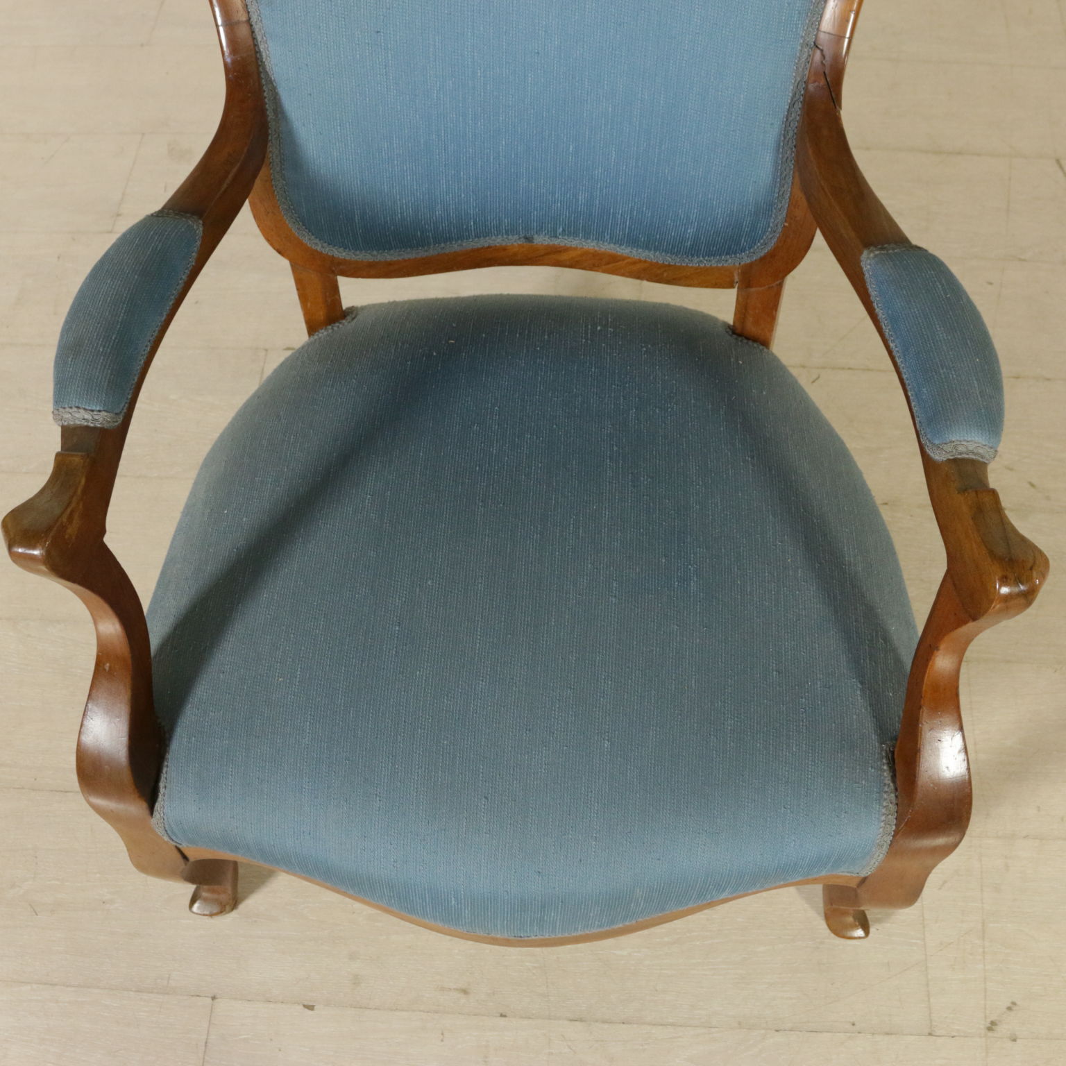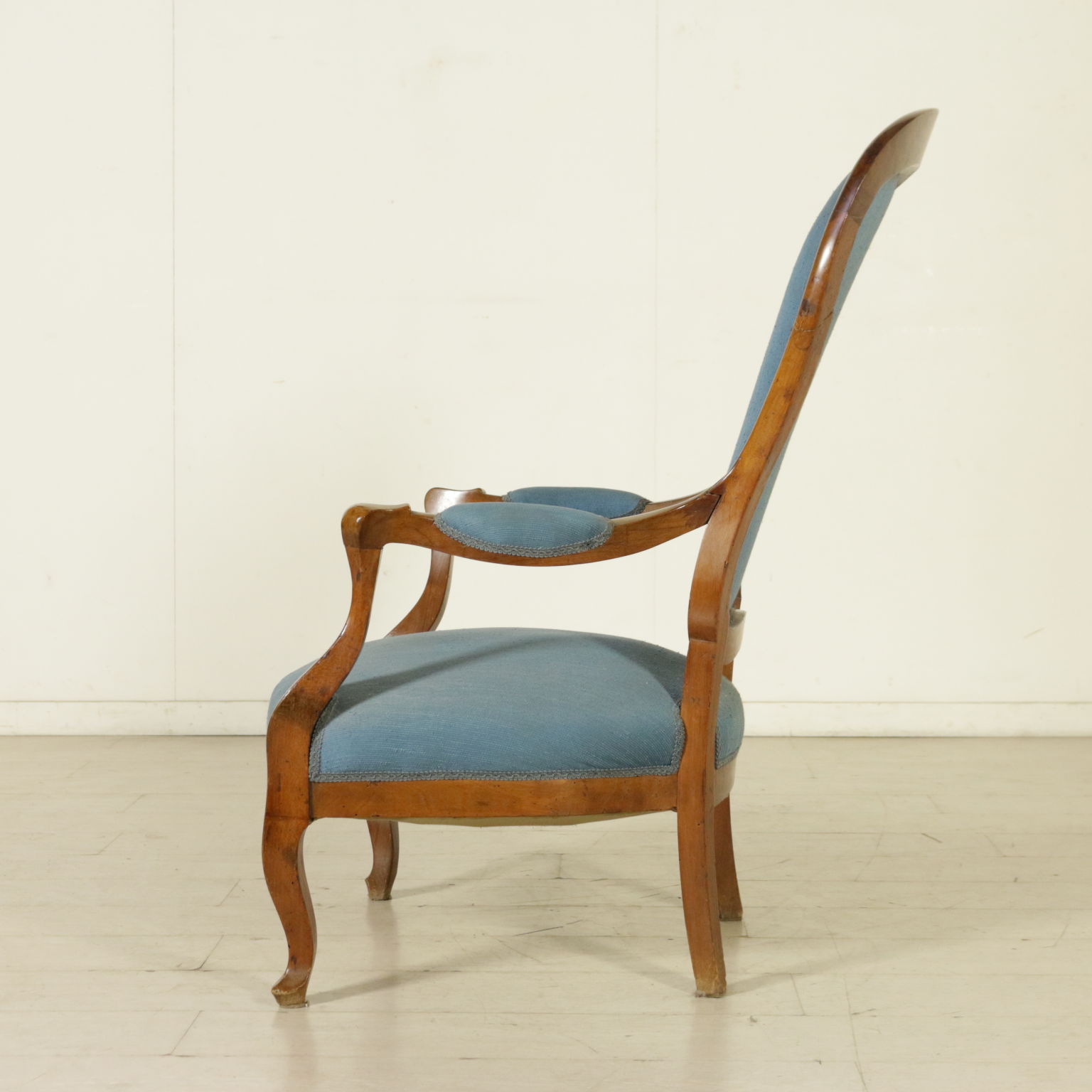 Poltrona dalla linea mossa con schienale e seduta imbottiti. Presenta rotture. In noce. Antiquariato, Italia, metà '800.