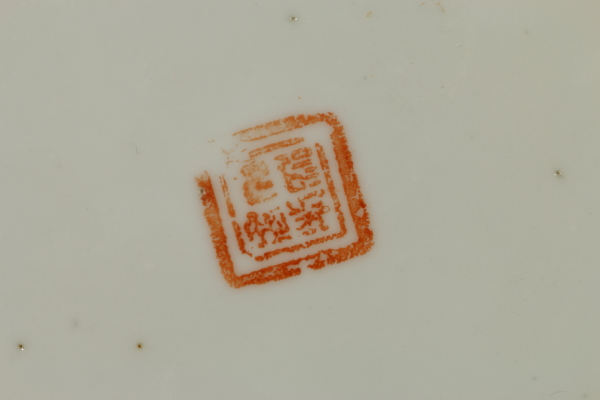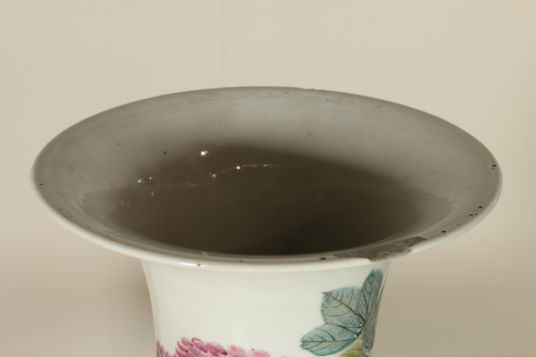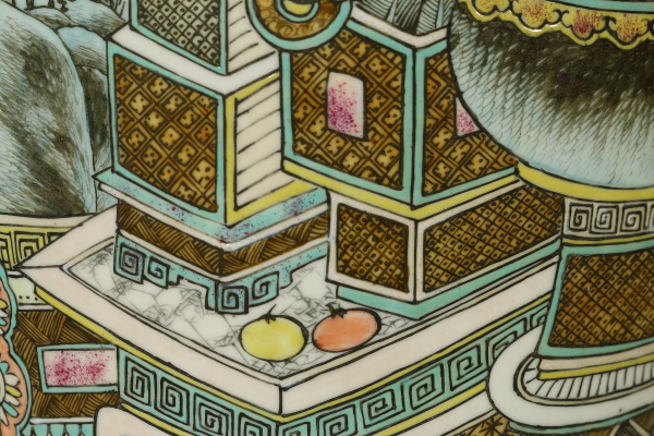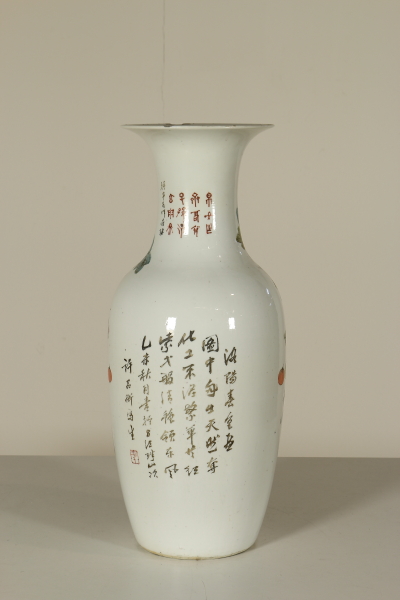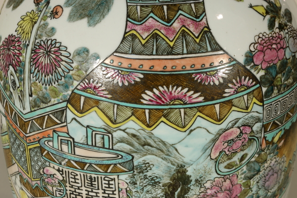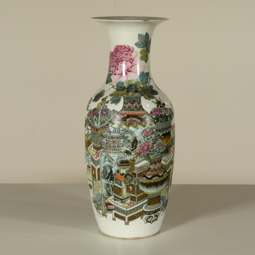 Grande vaso in porcellana con carteggio e ricco decoro policromo raffigurante composizione di vasi con fiori, alberi e frutti. Marchio sotto la base.