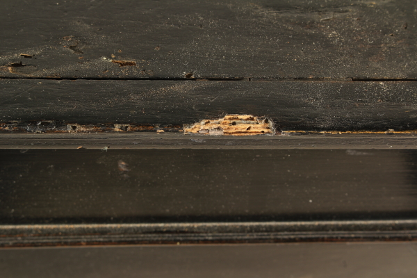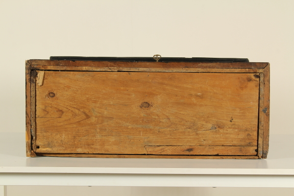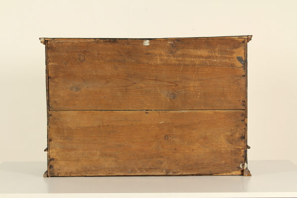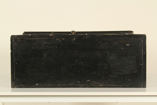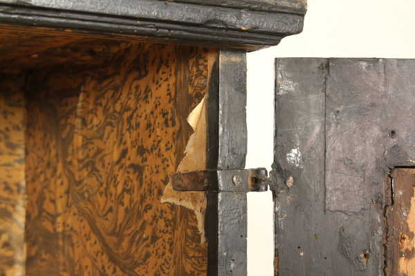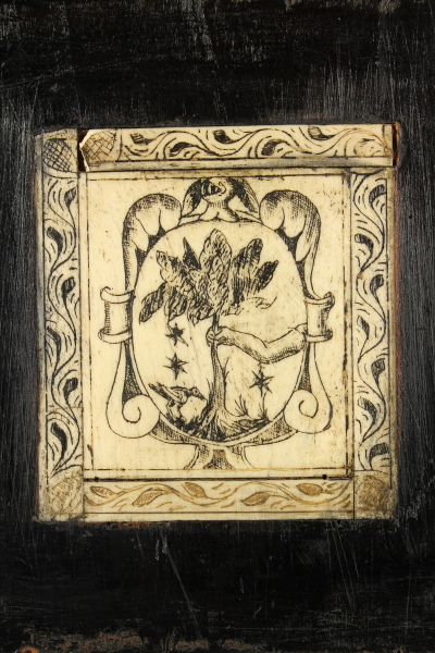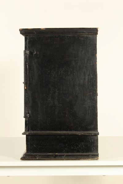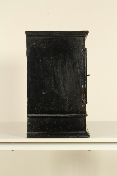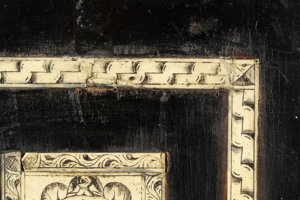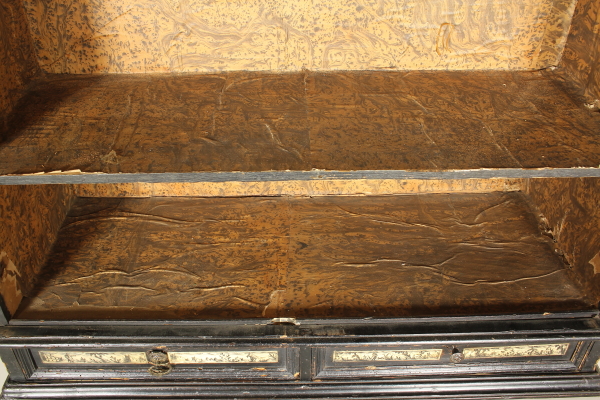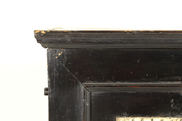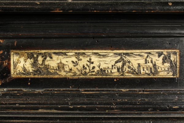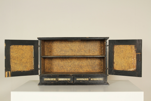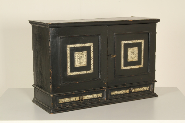 Stipo in noce ed abete a due ante a due cassettini ebanizzato sull'intera superficie. Intarsi a toppo in osso con incisioni di stemmi nobiliari e scene di vita.