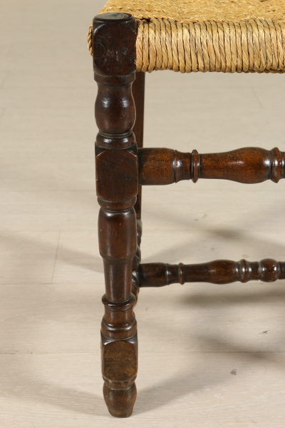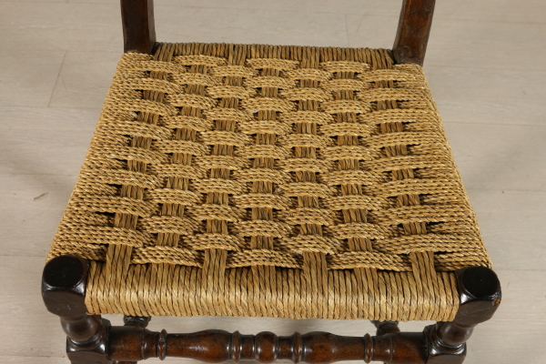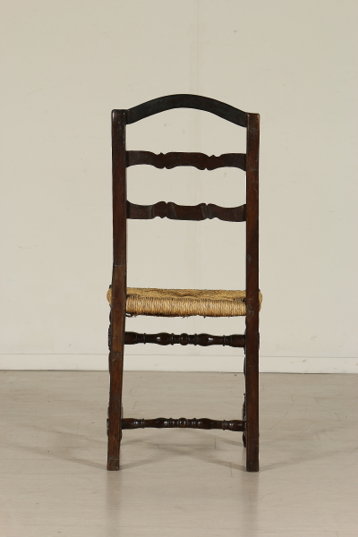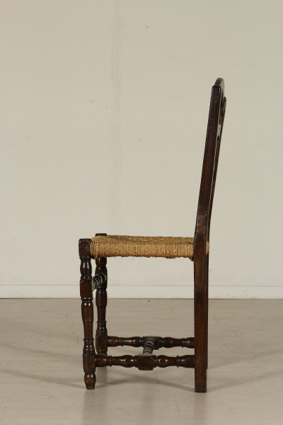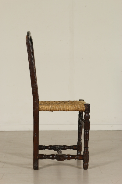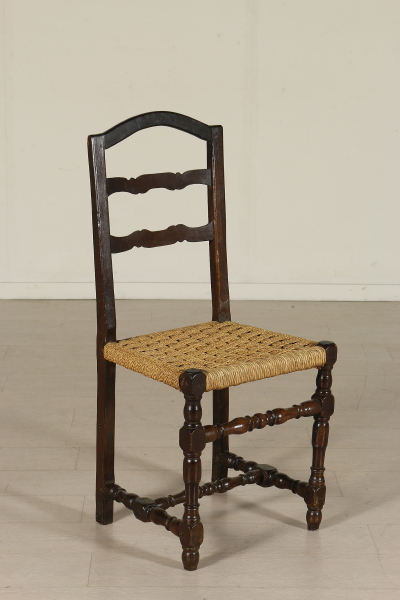 Sedie a rocchetto, hanno subito restauri e alcune sostituzioni. Seduta in paglia.