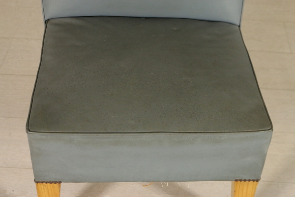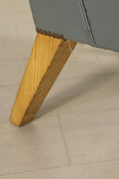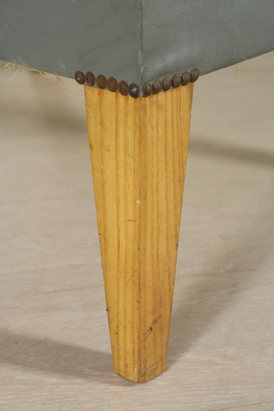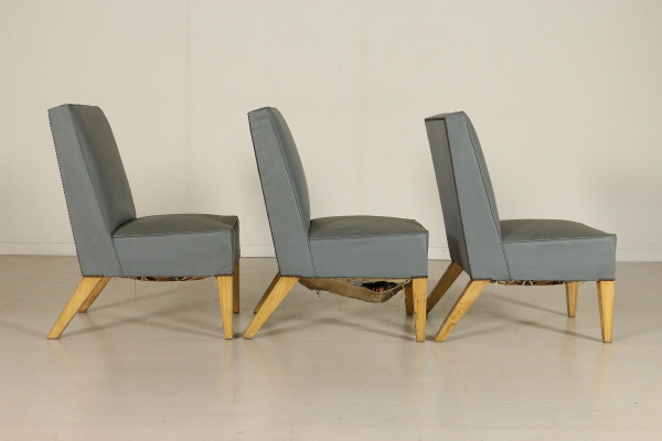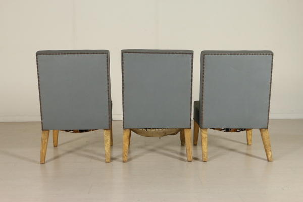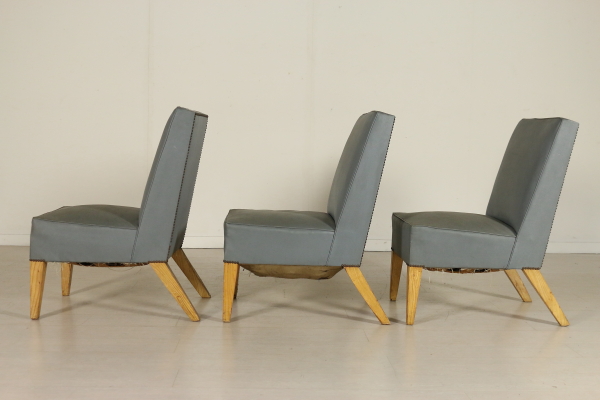Gruppo di tre poltroncine; imbottitura a molle, rivestimento in similpelle. legno di rovere. Discrete condizioni, presenta alcuni segni di usura. Altezza seduta: 39