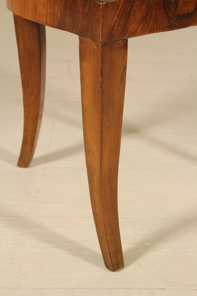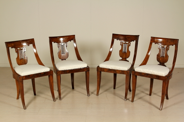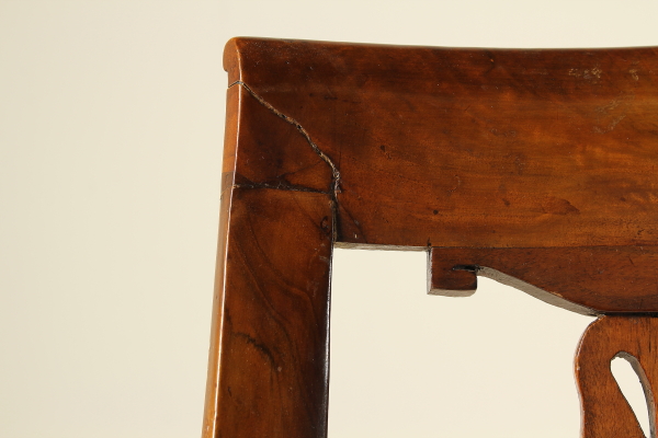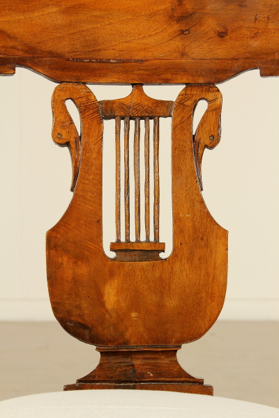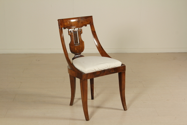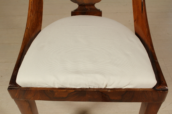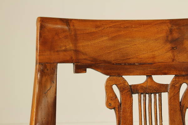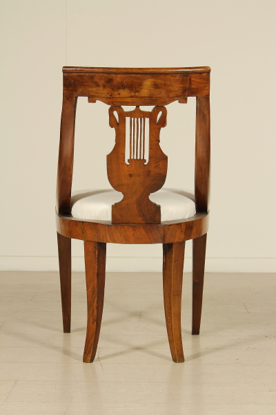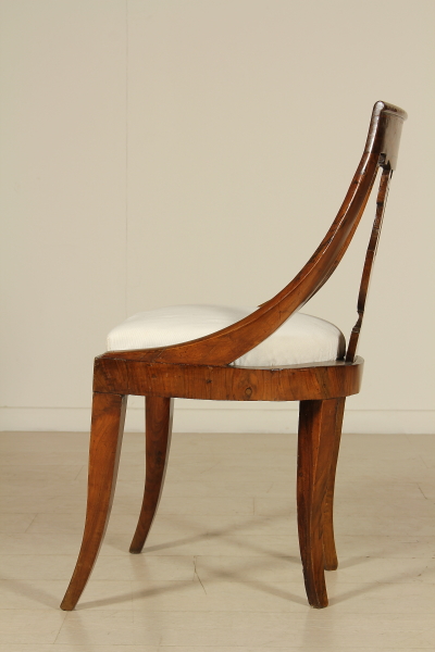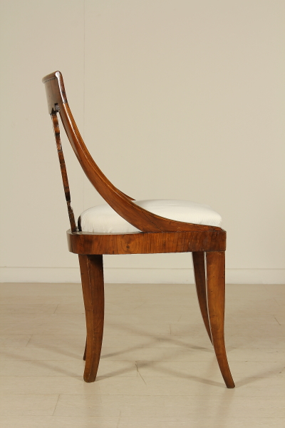 Gambe a sciabola, schienale a gondola con cartella intagliata e traforata. Fascia lastronata. Seduta imbottita.