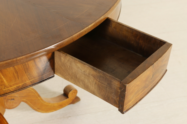 Balaustro e piedi con filettature a stucco. Piano tondo con due cassetti contrapposti nella fascia. Filettature intarsiate acero con rosone centrale.
