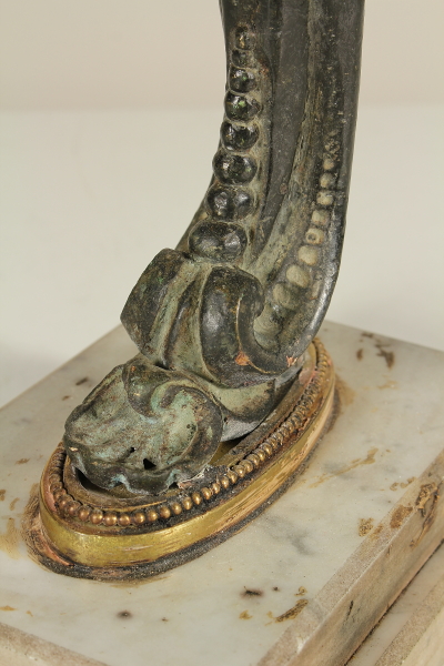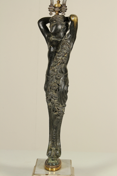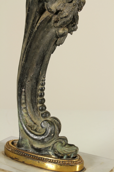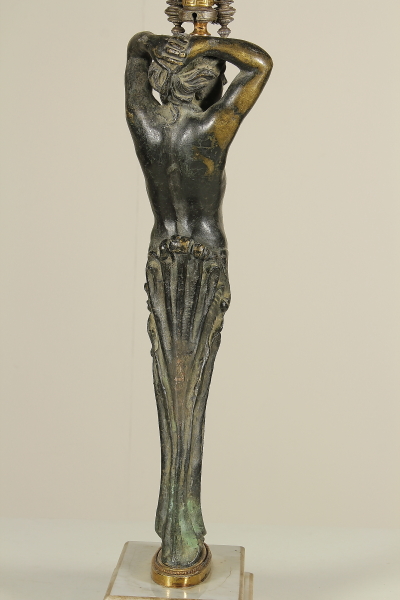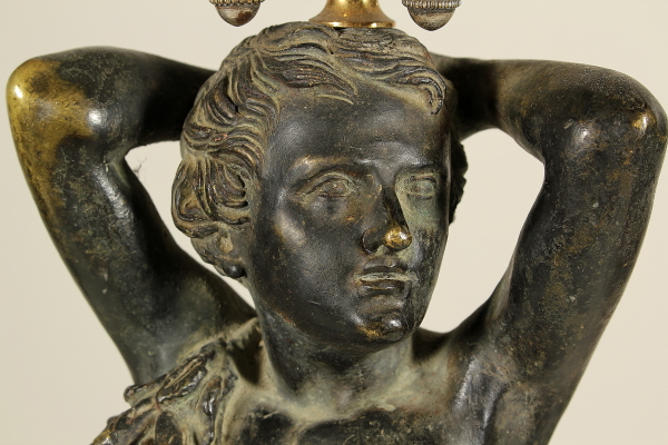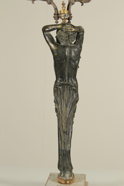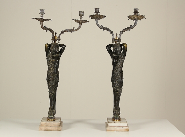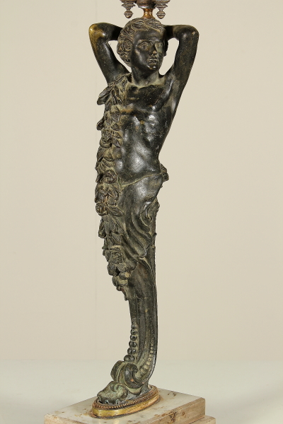 Coppia di fauni, maschile e femminile, con festoni di fiori terminanti in mensola con conchiglia. Le due figure con le mani poggiate sulla nuca avevano la funzione di reggere un piano di tavolino secondo i modelli dell'epoca. Successivamente trasformati in candelieri con bracci argentati.