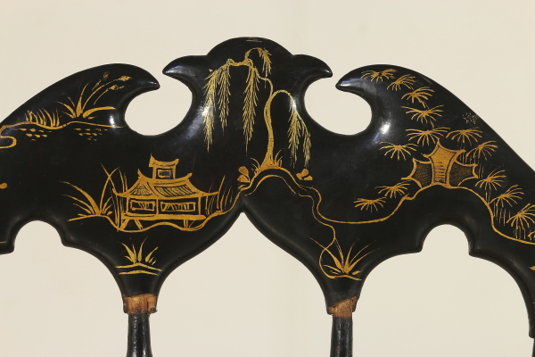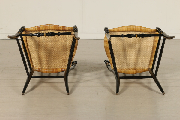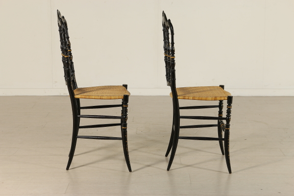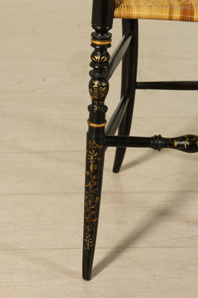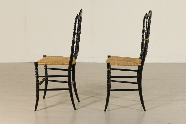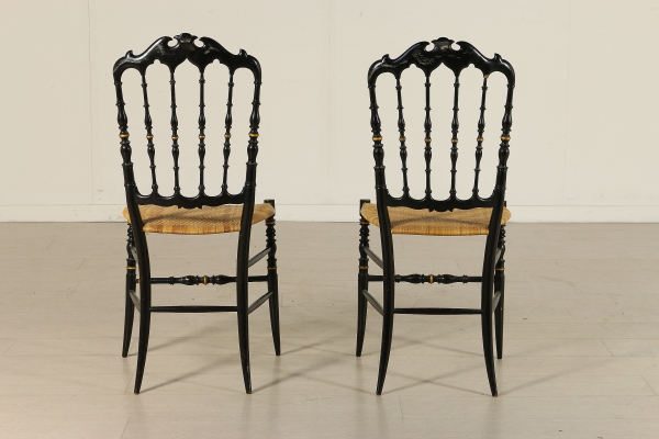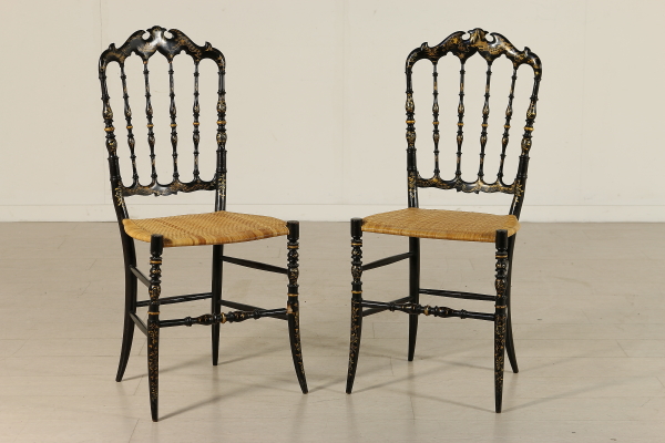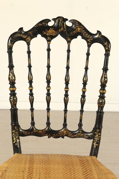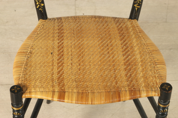 Laccate e decorate con motivi chinoiserie. Tornite con seduta incannucciata.
