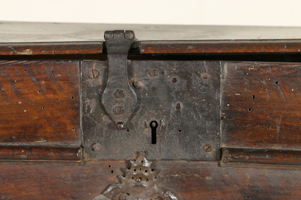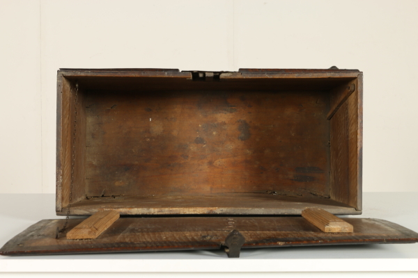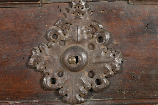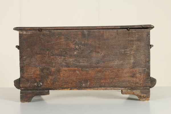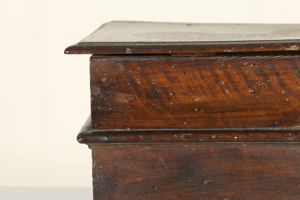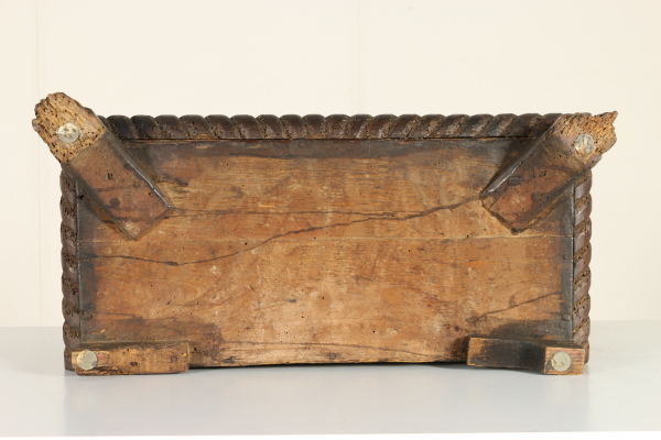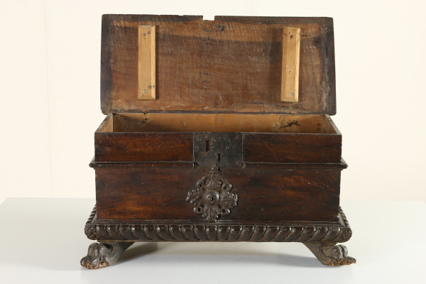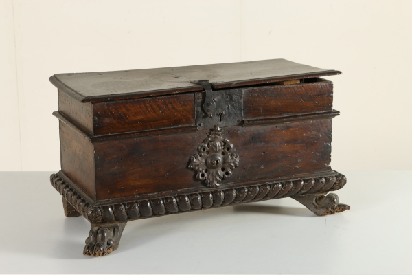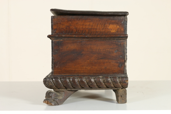 Piccola panca-baule in noce massello con piano apribile. Il cornicione della base di epoca coeva è stato intagliato e abbellito in epoca successiva. Serratura sostituita e grosso medaglione fogliaceo in metallo nella parte centrale. Piedi ferini.