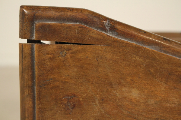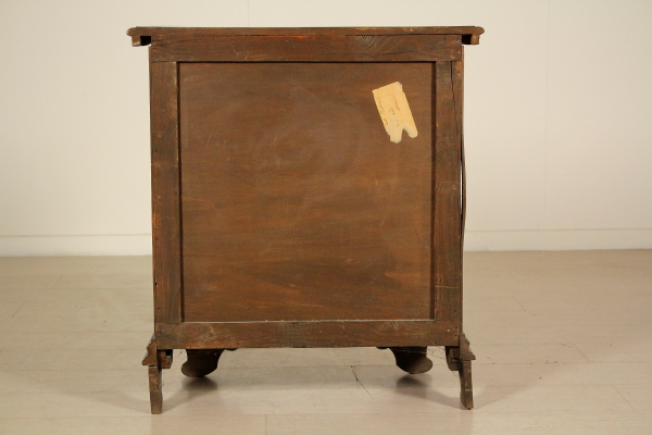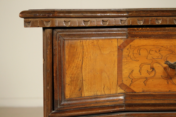 Fronte mosso, presenta tre cassetti lastronati e intarsiati.