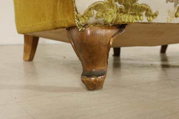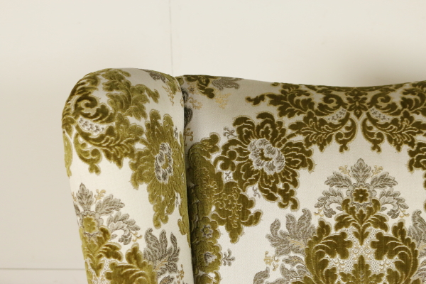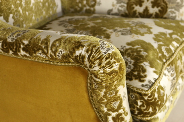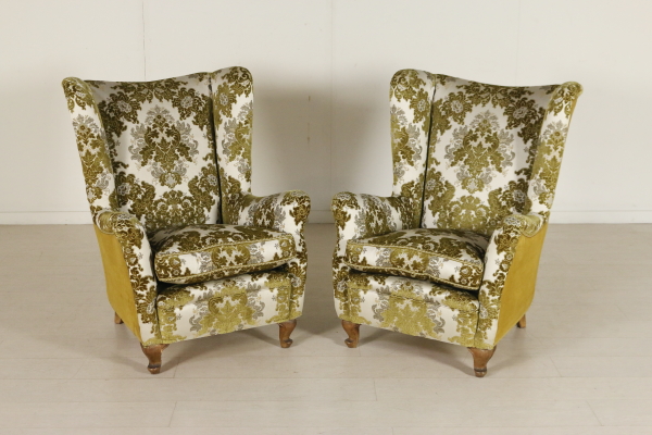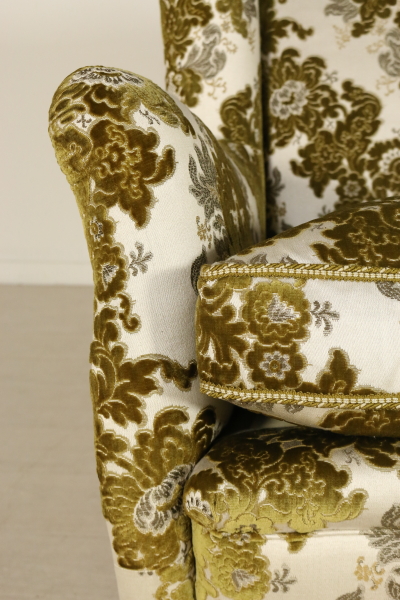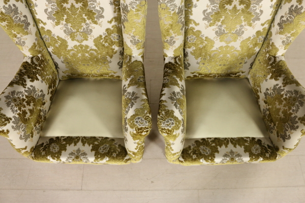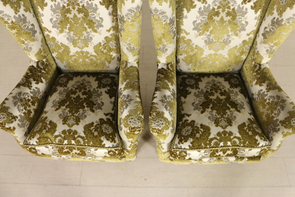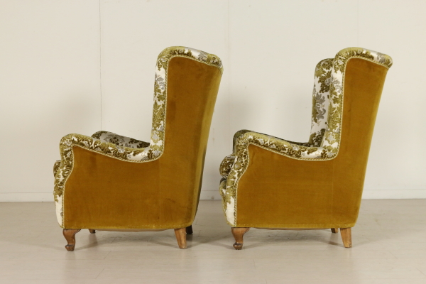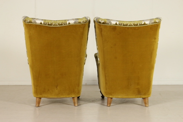 Coppia di poltrone; imbottitura a molle, cuscini in piuma, rivestimento in velluto e velluto operato. Buone condizioni, presentano piccoli segni di usura.