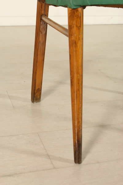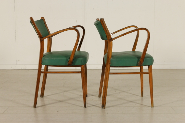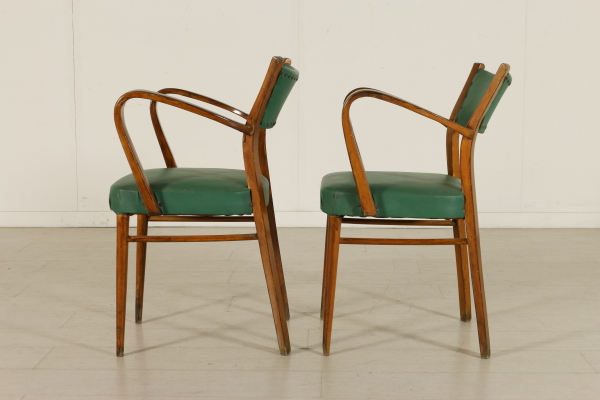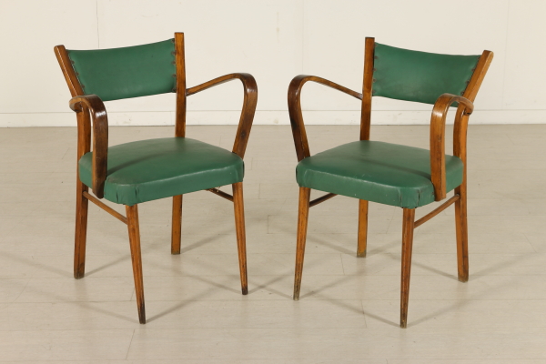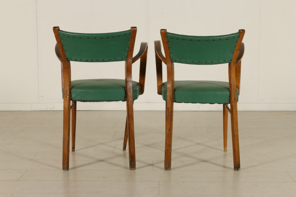 Coppia di poltroncine; legno di faggio, imbottitura a molle e crine, rivestimento in similpelle. Buone condizioni, presentano piccoli segni di usura.