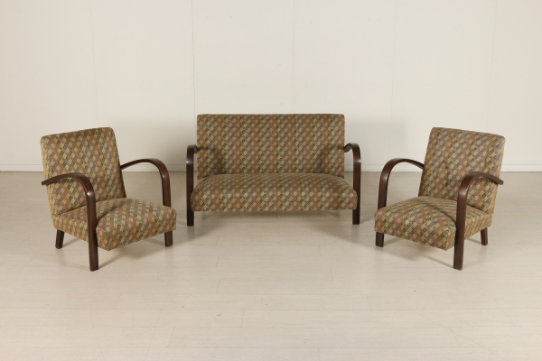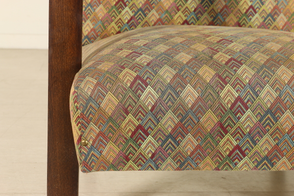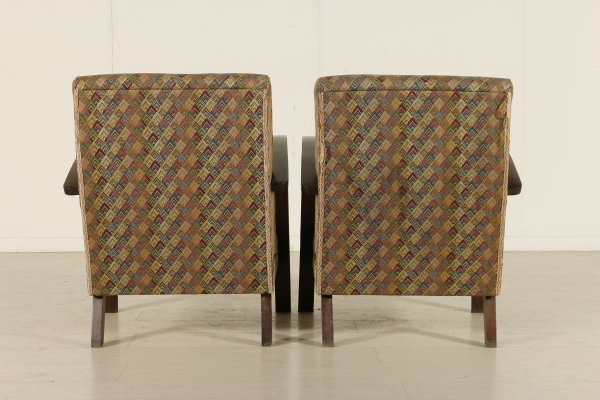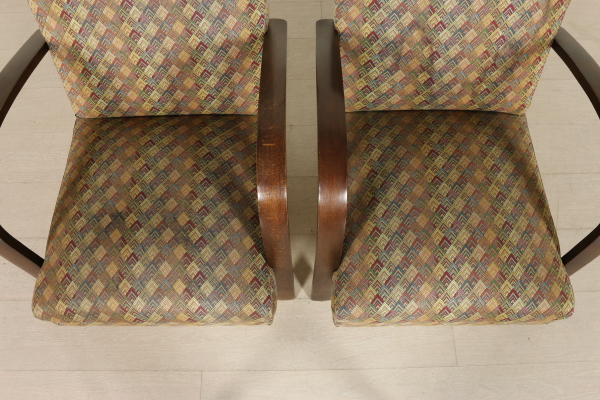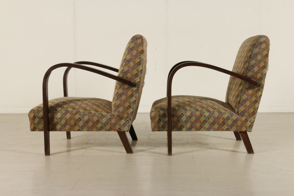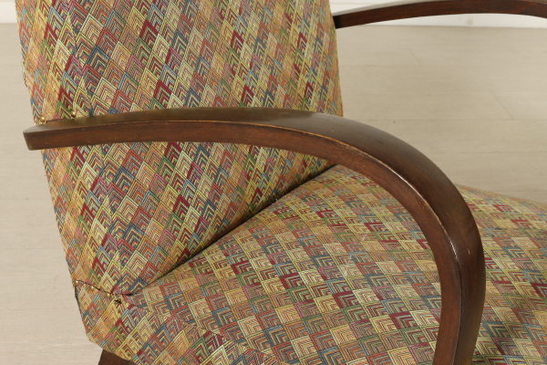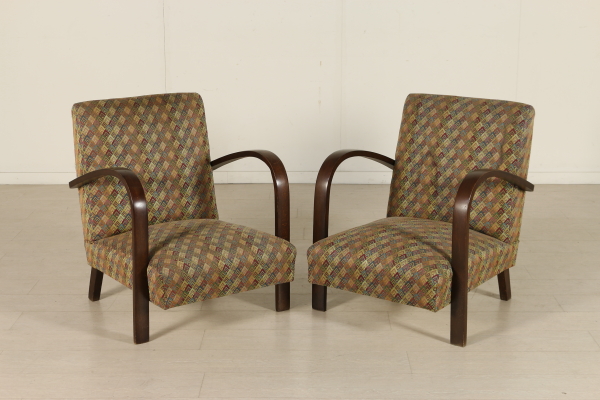 Coppia di poltrone; legno di faggio curvato, imbottitura a molle, rivestimento in tessuto. Buone condizioni, presentano piccoli segni di usura.