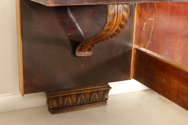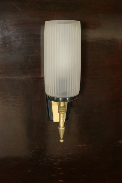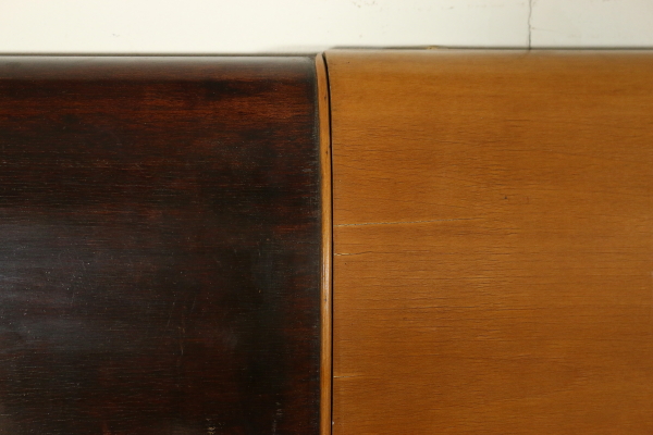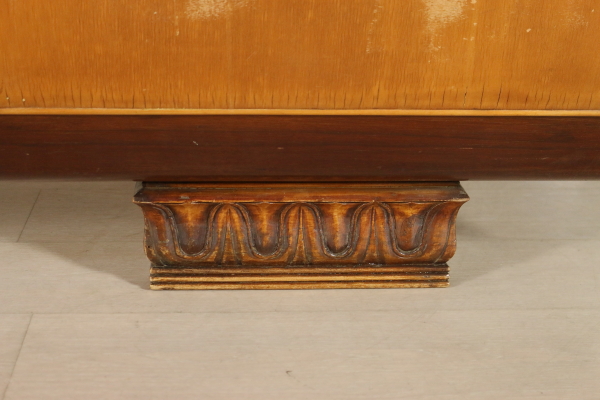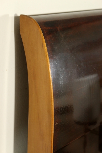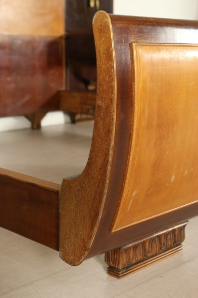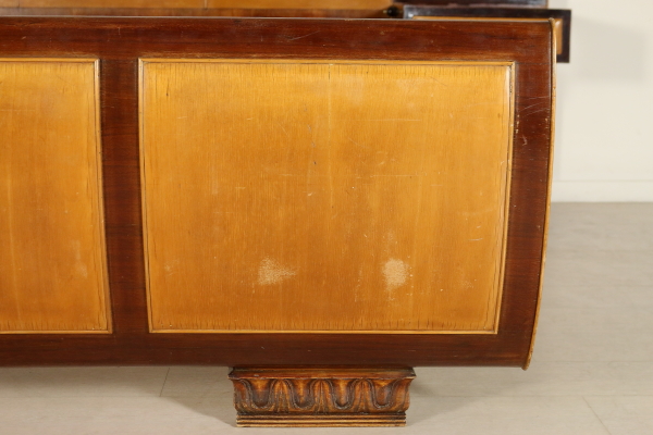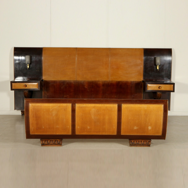 Letto matrimoniale con comodini pensili e applique; legno impiallacciato mogano, acero e parti tinte ebano.