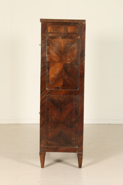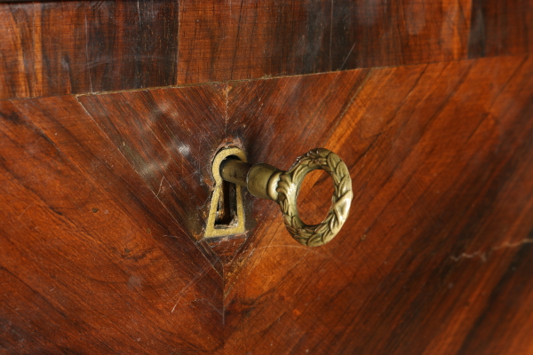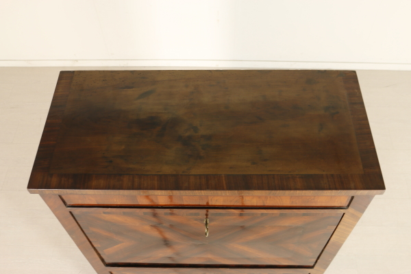 Secretaire lastronato sull'intera superficie, presenta nella parte bassa due ante con bella serratura interna. Nel sopralzo anta a ribalta celante scarabattolo con sei cassetti e blocco vani a giorno estraibile con segreto. Fronte e fianchi con lastronatura quadripartita a motivo geometrico. Piano lastronato noce. Piedi tronco-piramidali.