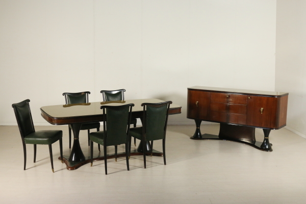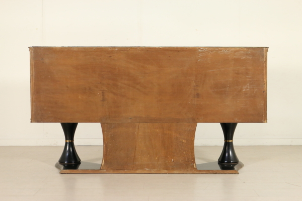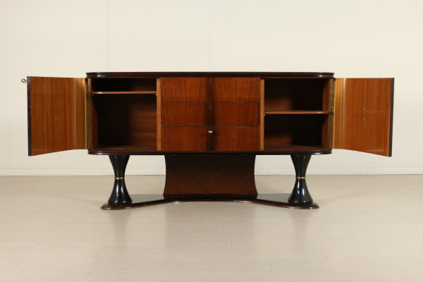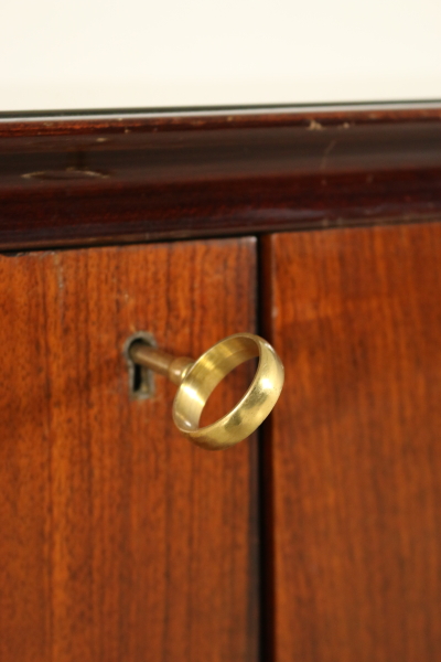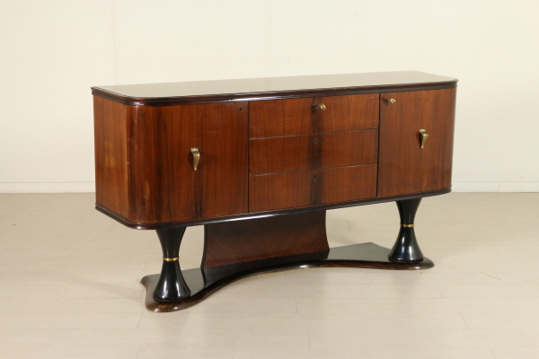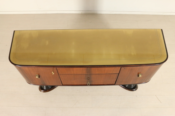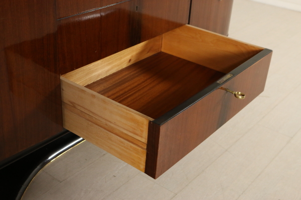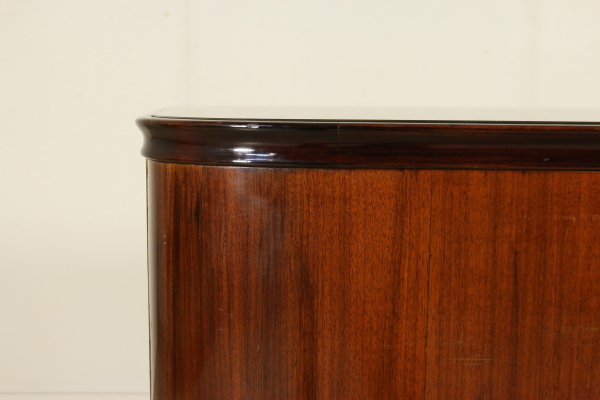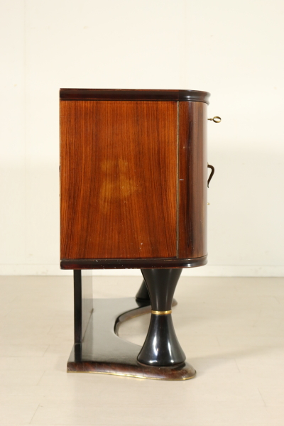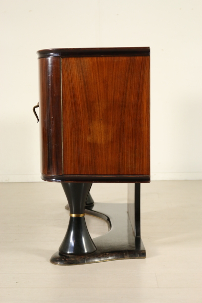 Mobile buffet; legno impiallacciato palissandro, vetro retro trattato, ottone. Buone condizioni, presenta piccoli segni di usura.