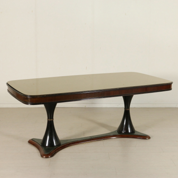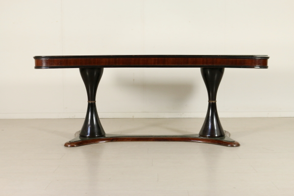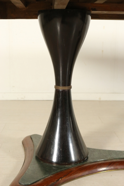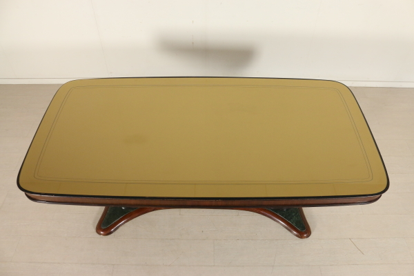 Tavolo; legno impiallacciato palissandro e legno ebanizzato, vetro retro trattato, ottone, marmo. Buone condizioni, presenta piccoli segni di usura.