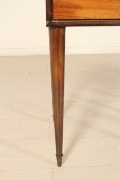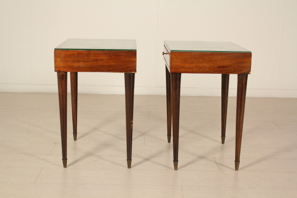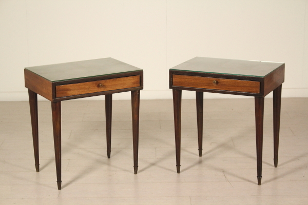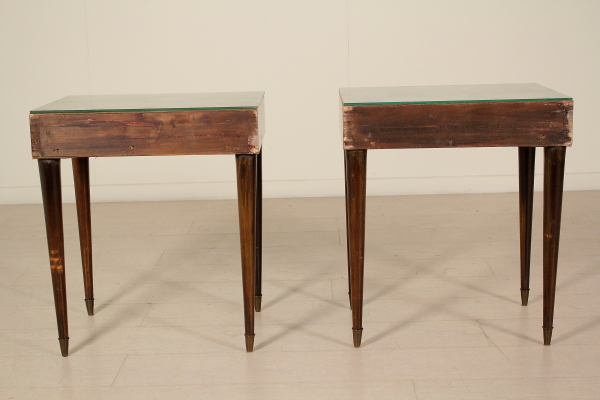 Coppia di comodini; legno impiallacciato palissandro; vetro sul piano. Buone condizioni, presentano piccoli segni di usura.