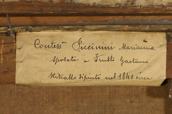 Olio su tela. Al retro è presente etichetta che identifica la signora ritratta nella Contessa Piccinini Marianna e data l'opera (1840). Presentato in cornice coeva dorata, con vetro.