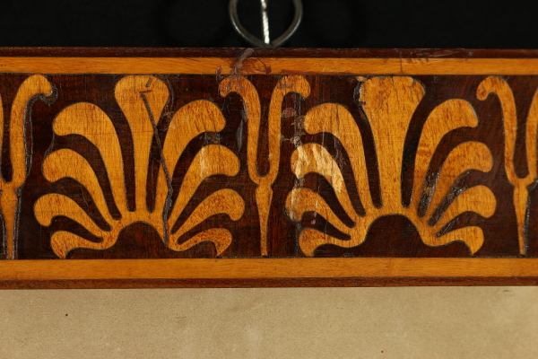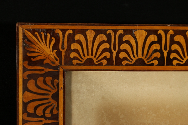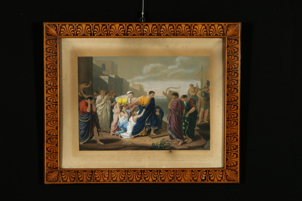La bella cornice è in noce con intarsi in bosso. Incornicia incisione francese di fine '700, acquarellata a mano, raffigurante il ritorno a Cartagine di Attilio Regolo.Con vetro.
