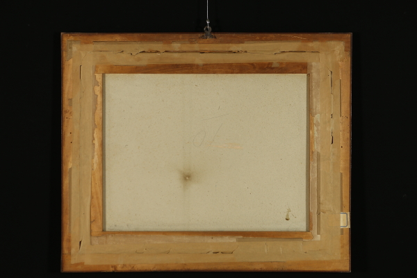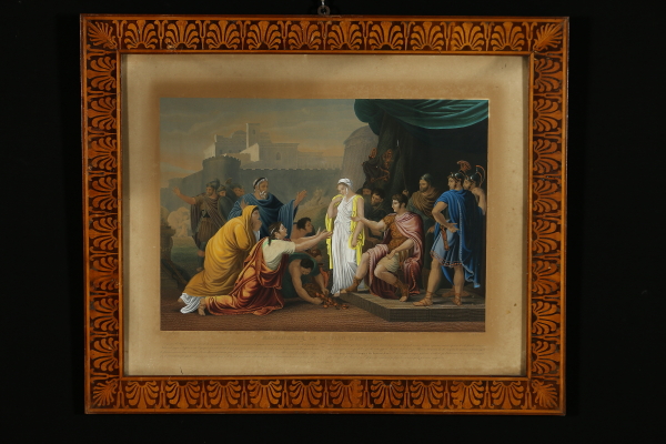 In noce con intarsi in bosso. Incornicia incisione francese di fine '700,acquarellata a mano, raffigurante la magnanimità di Scipione l'africano. Con vetro.