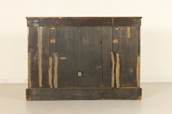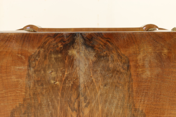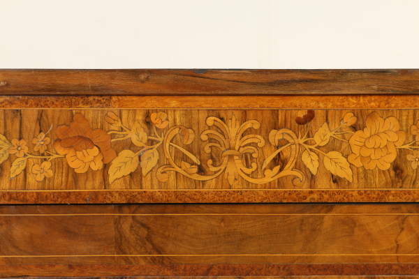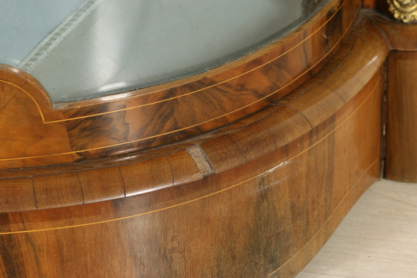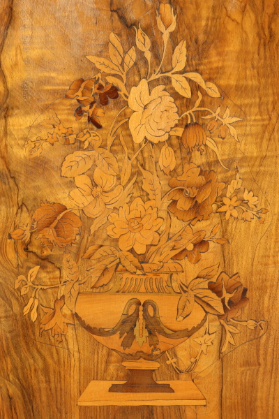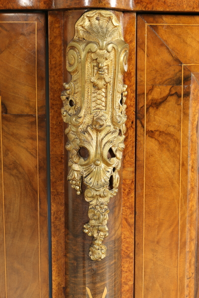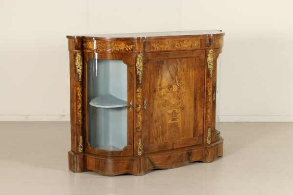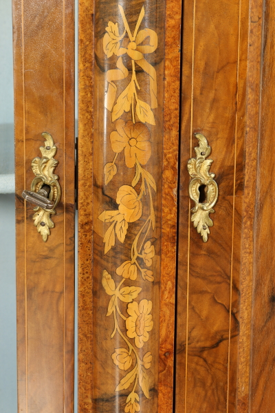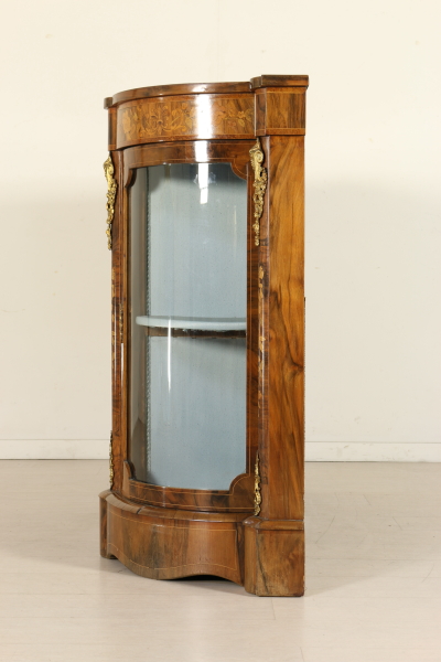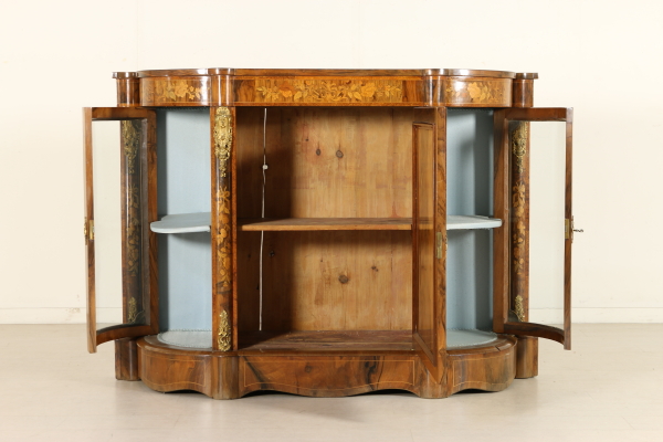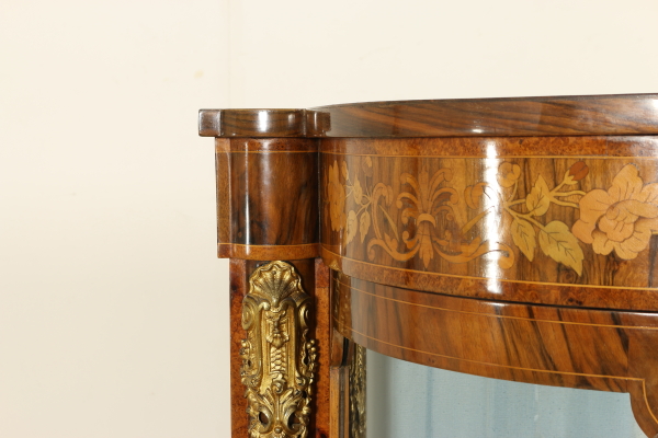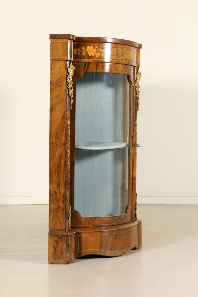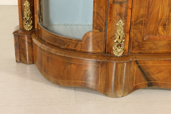 Mossa sui fianchi retta da zoccolatura sagomata. Tre ante di cui le laterali con vetri. Montanti con mezze colonne con fregi in bronzo dorato. Riserve con intarsi floreali e filettature.