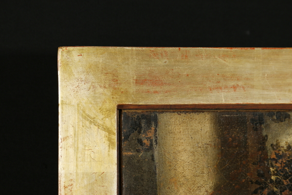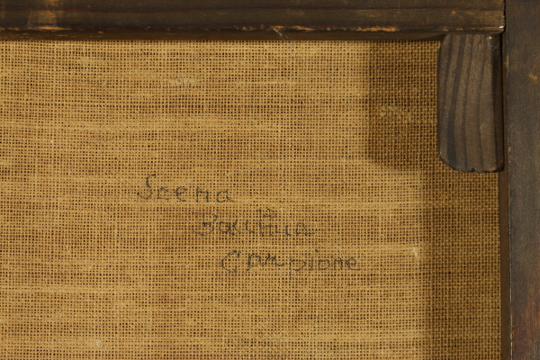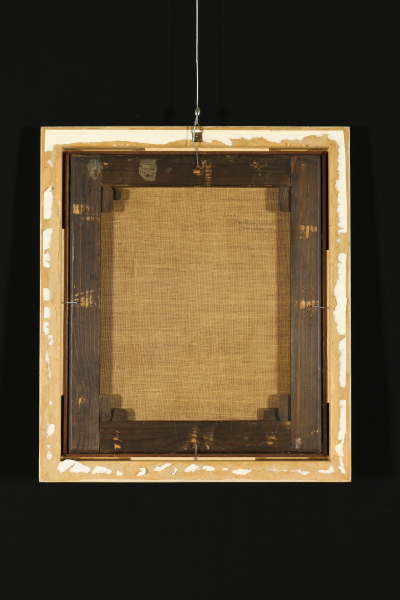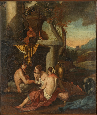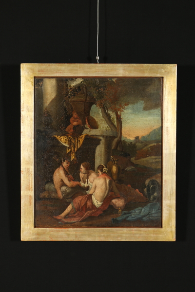 Olio su tela. Un fauno intrattiene due fanciulle sullo sfondo di una struttura architettonica. In cornice.