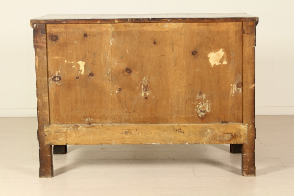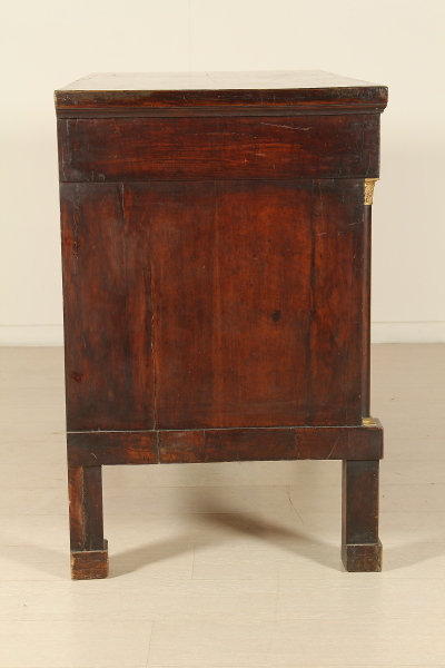 Montanti con mezze colonne con capitelli dorati a pastiglia e piedi a plinto. Presenta due cassetti più uno sottopiano aggettante.
