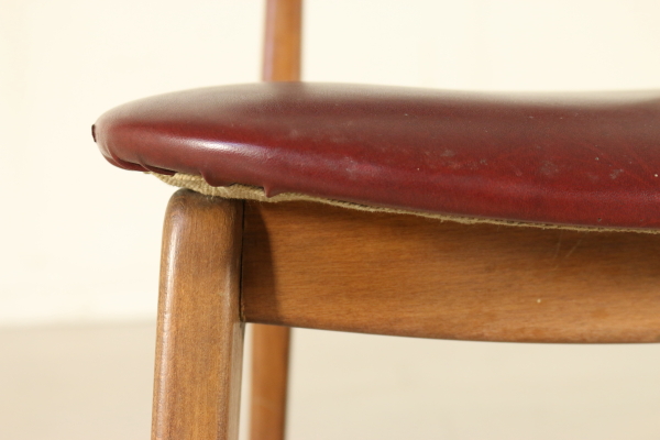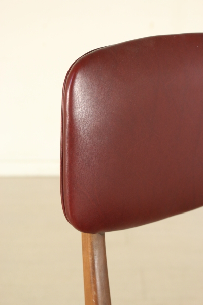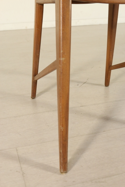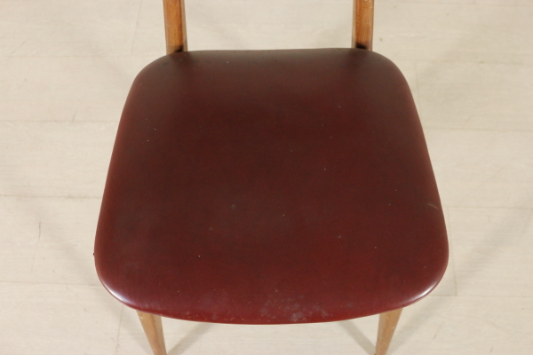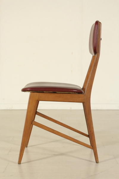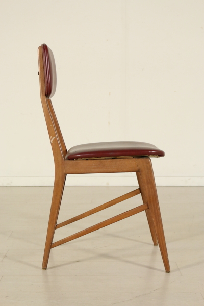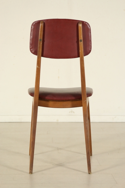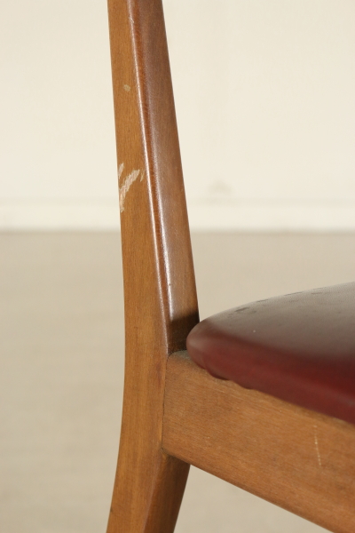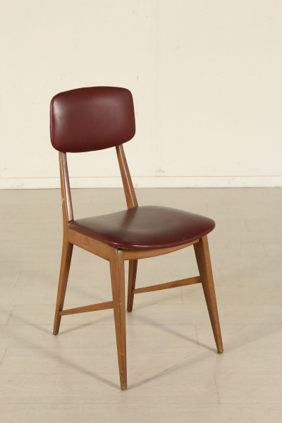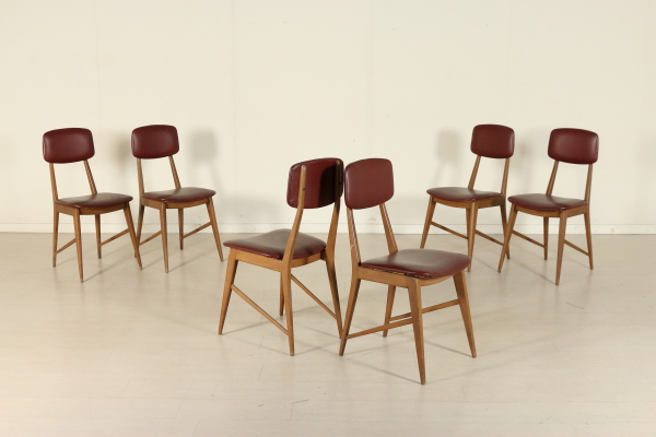 Gruppo di sei sedie; legno di faggio tinto, imbottitura in espanso, rivestimento in skai. Buone condizioni, presentano piccoli segni di usura.