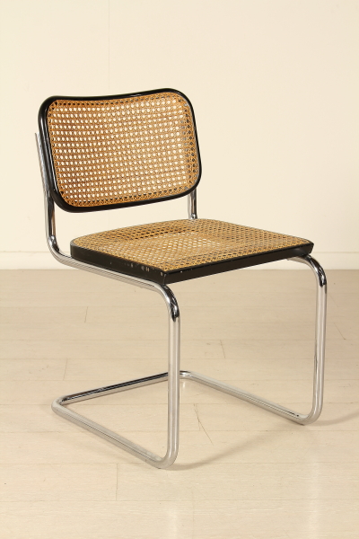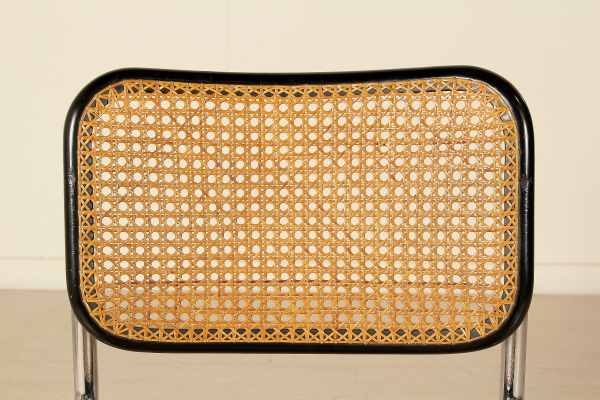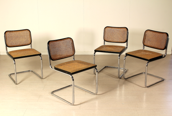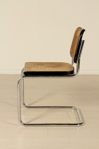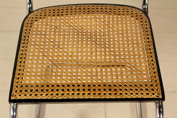 Gruppo di quattro sedie; tubolare in metallo cromato; telaio in legno laccato con paglia di Vienna. Buone condizioni, presentano piccoli segni di usura.