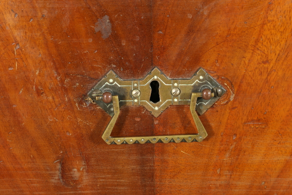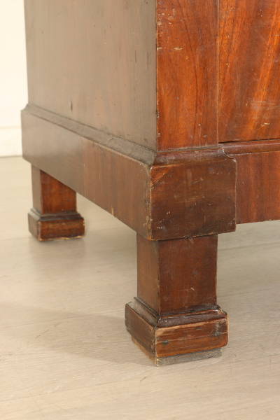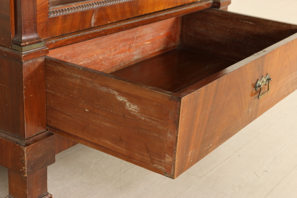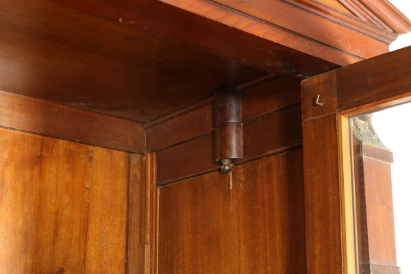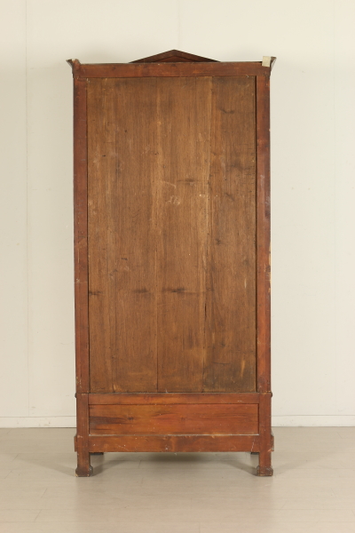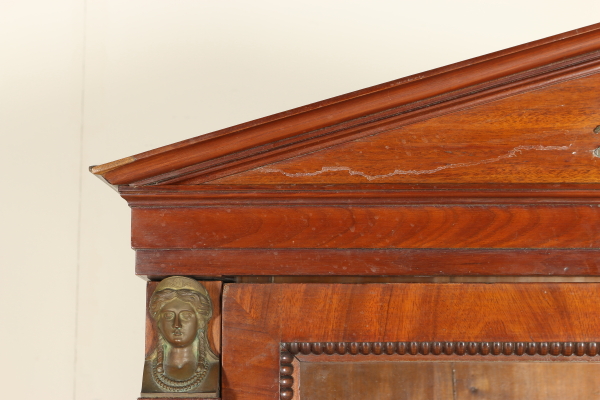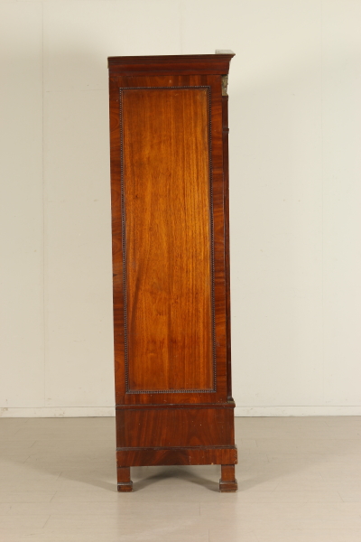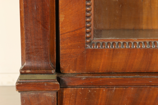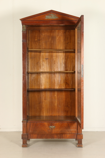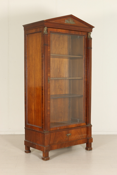 Montanti a plinto rovesciato con busti di donna in bronzo. Presenta un cassetto e un'anta con vetro e cornice baccellata. Cimasa a timpano con fregio in bronzo.