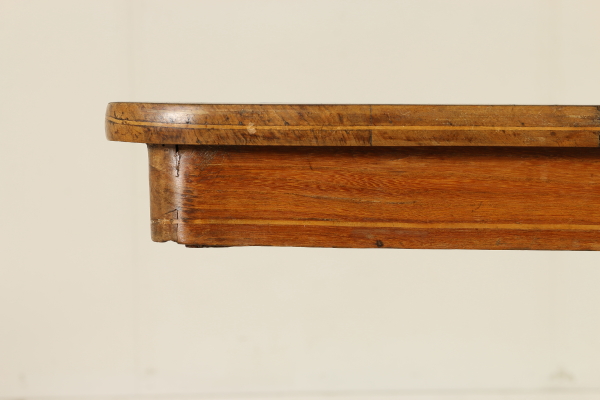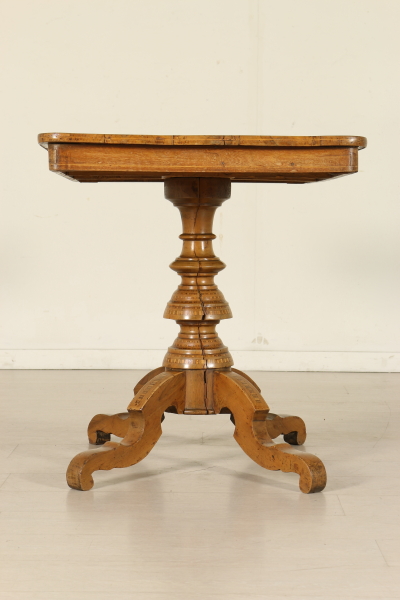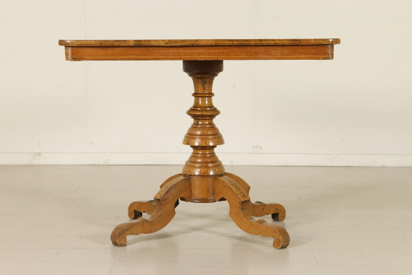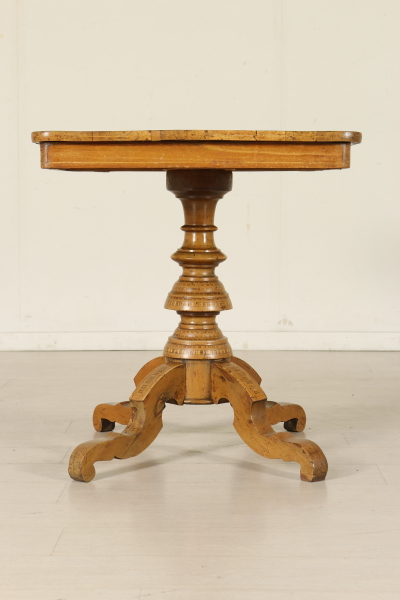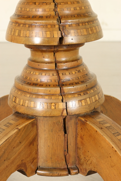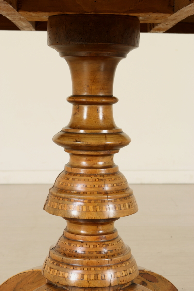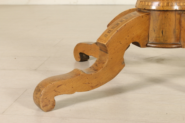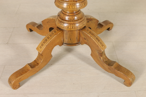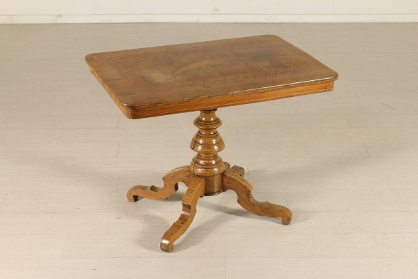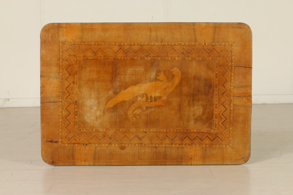 Balaustro tornito terminante con piedi mossi. Piano rettangolare con pavone intarsiato e inciso. Filettature intarsiate in essenze varie.