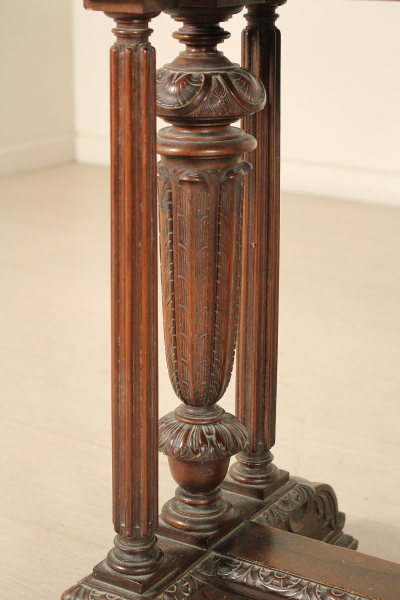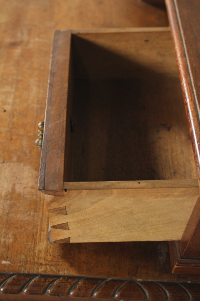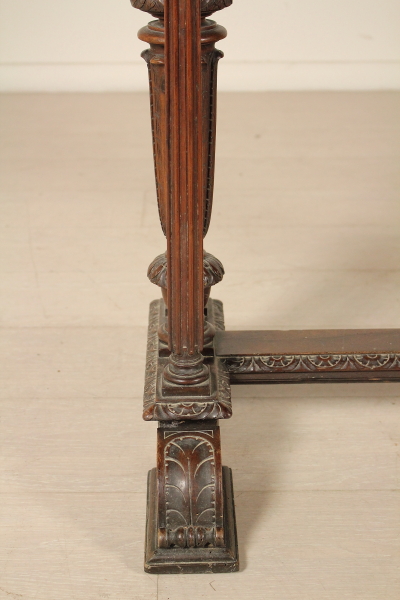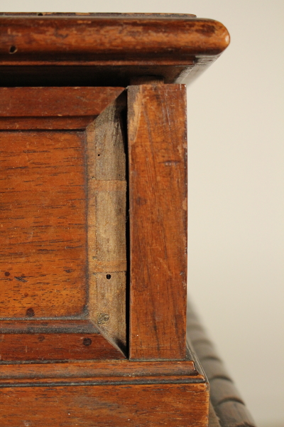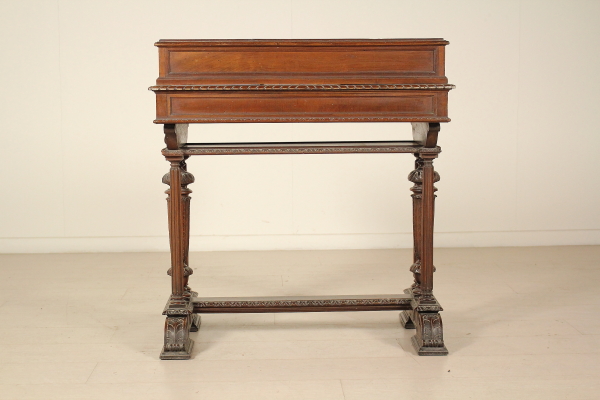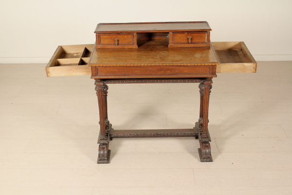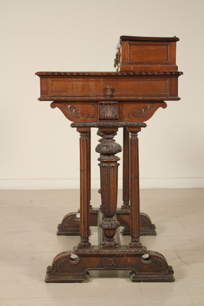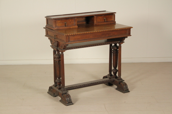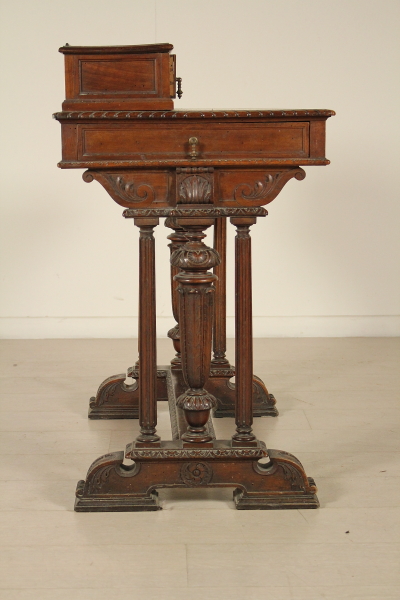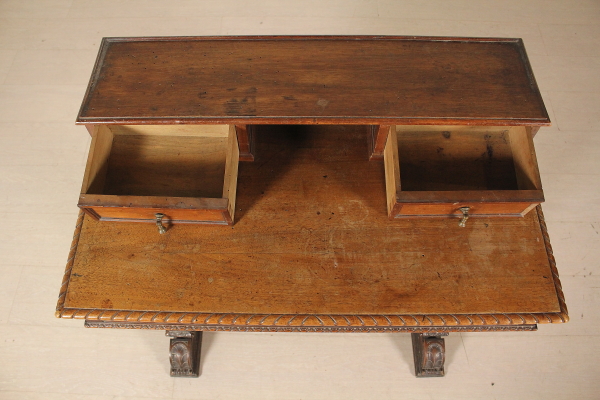 Retto da colonne e basamento intagliati. Fascia con cassetti laterali. Alzatina con vano e coppia di cassetti.