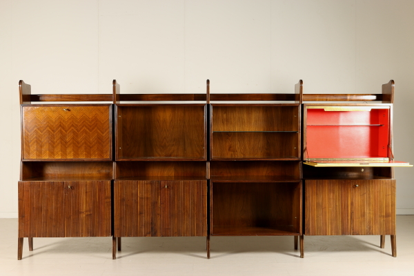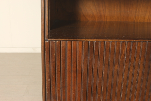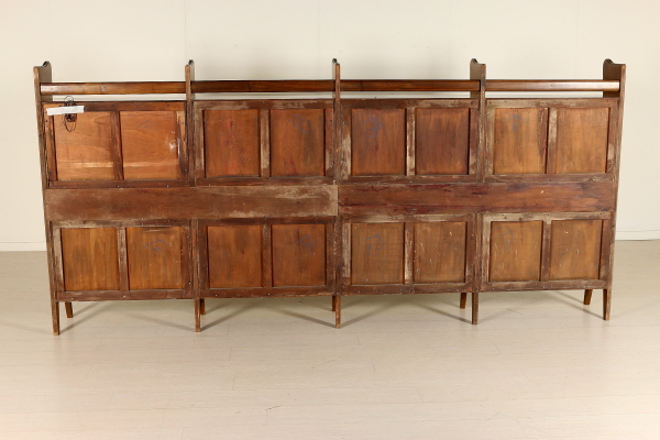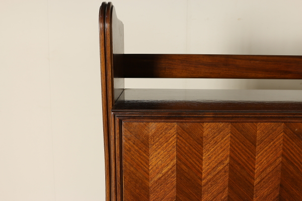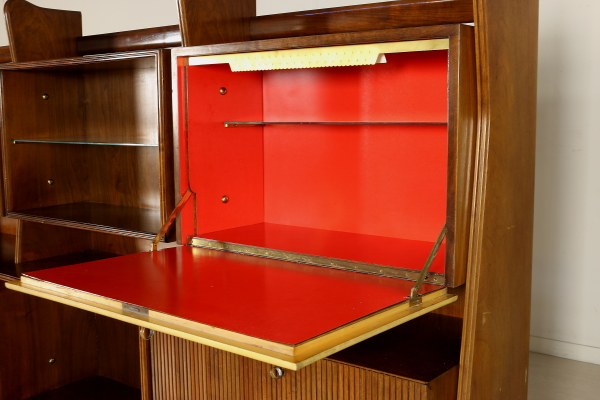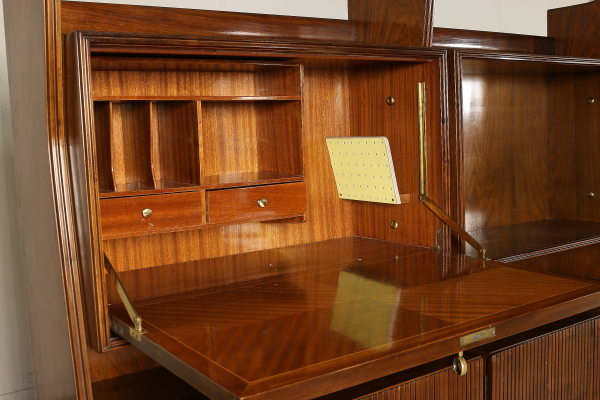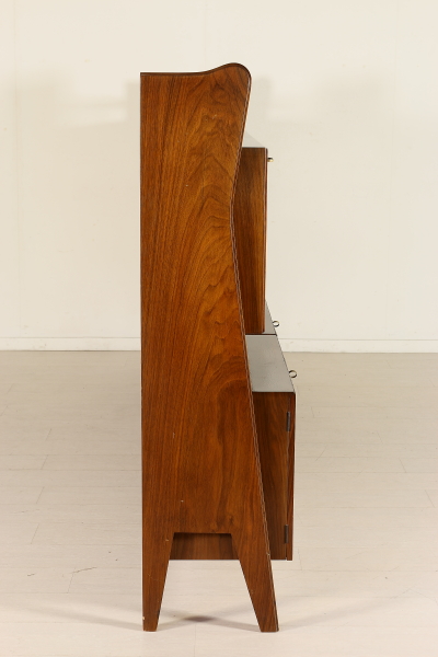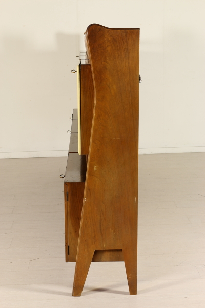 Mobile con doppia ribalta; legno impiallacciato mogano tinto, pannelli grissinati, carta pergamena. Buone condizioni, presenta piccoli segni di usura.