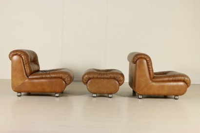Coppia di poltrone con pouf: imbottitura in espanso, rivestimento in pelle. Buone condizioni, presentano segni di usura sul rivestimento in pelle.