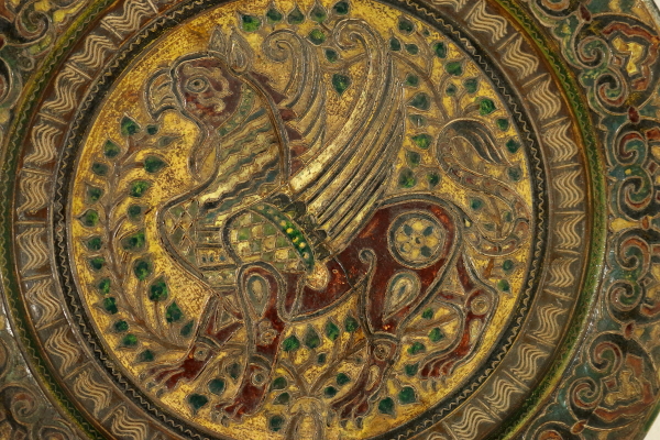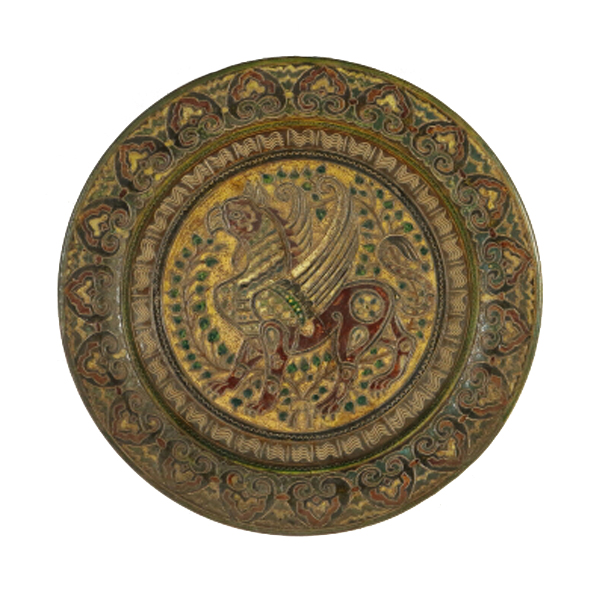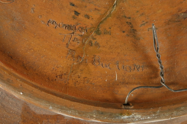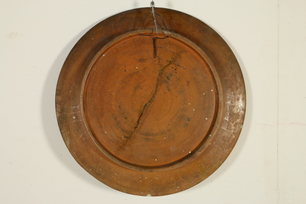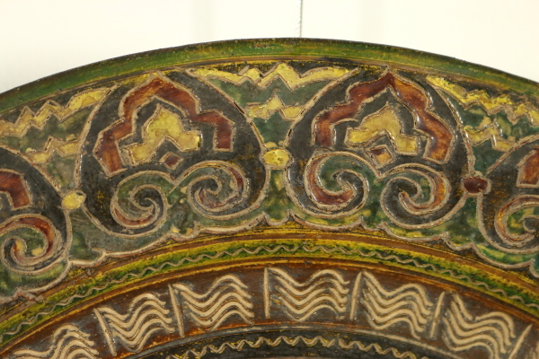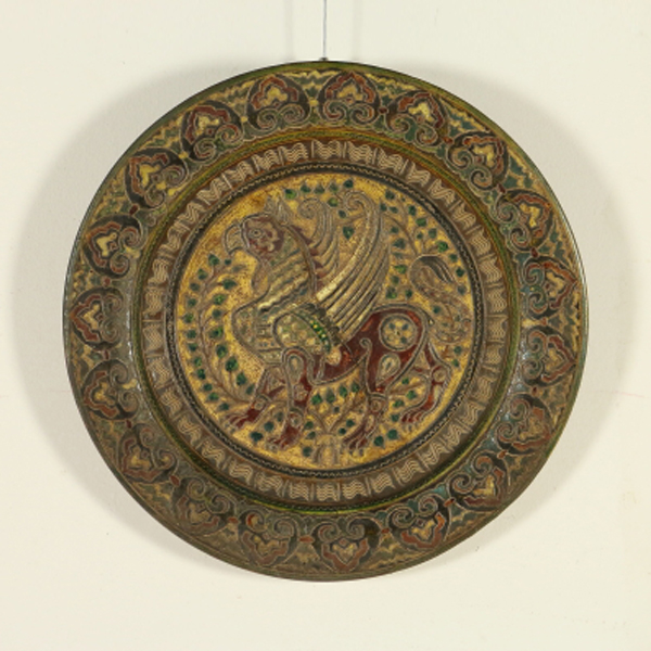 Piatto in terracotta, ingobbiato e graffito a punta. Al centro del piatto è raffigurato un grifone contornato da piante, sul bordo decoro a greche. Restauro ben visibile al verso. Marchio della manifattura.